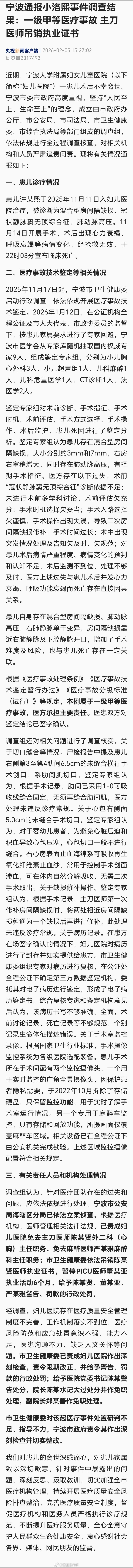 小洛熙事件最新通报宁波通报小洛熙事件调查结果:一级甲等医疗事故 主刀医师吊销执业证书