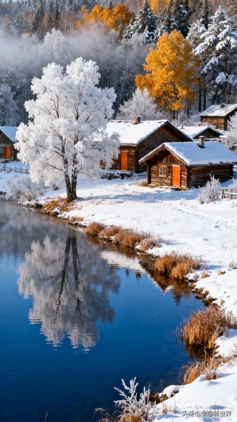 冬日仙境,木屋与雪树相映成趣,静谧而美丽。冬日杉树林风景风景木屋