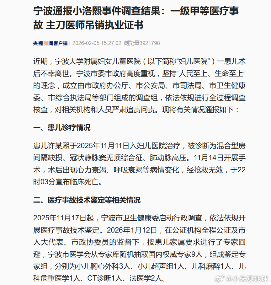【宁波患儿术后离世调查结果】小洛熙事件为一级甲等医疗事故近期,宁波大学附属妇女儿童医院一患儿术后不幸离世。宁波市委市政府高度重视,成立多部门组成的调查组,依法依规进行全过程调查核查,于2月5日发布情况通报:医疗事故技术鉴定专家组判定此例属于一级甲等医疗事故,医方承担主要责任,医患双方对鉴定结论已签字确认;宁波市公安局海曙区分局已依法立案侦查;主刀医师陈某贤被免去外二科(心胸)主任职务、吊销医师执业证书,相关涉事医师、医院及领导均受到相应处分处理,市卫生健康委对该起医疗事件处置研判不足、指导不力,被责令作出深刻检查并切实整改。小洛熙事件最新通报 网页链接