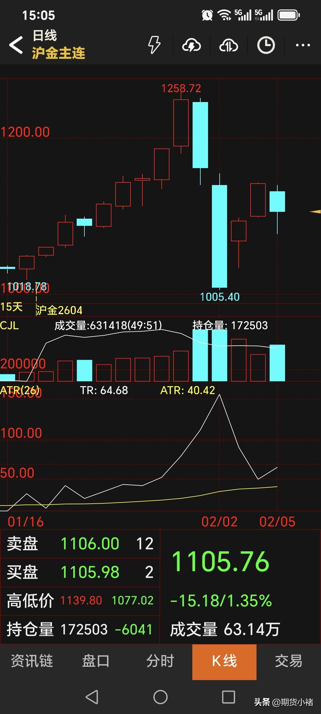 经过连续两天 反弹上涨以后, 周四国内黄金期货 再度回落,盘中跌破1100关口。 主力合约收盘于1105.76元, 比昨日的收盘低了35.94元; 结算价1112.6元, 比昨日的低了8.34元。 当日的收盘价低于开盘价, 因此从盘面看, 收于一根下跌的阴线!