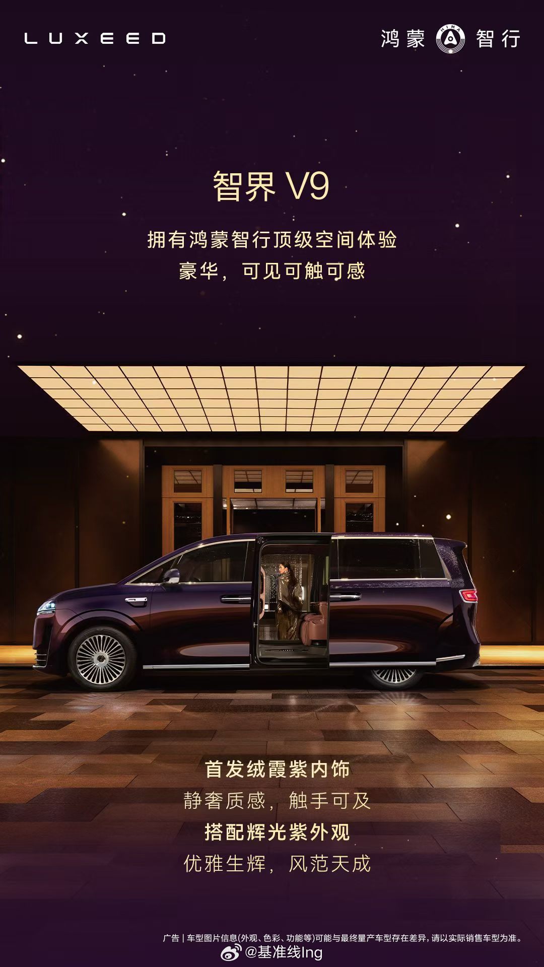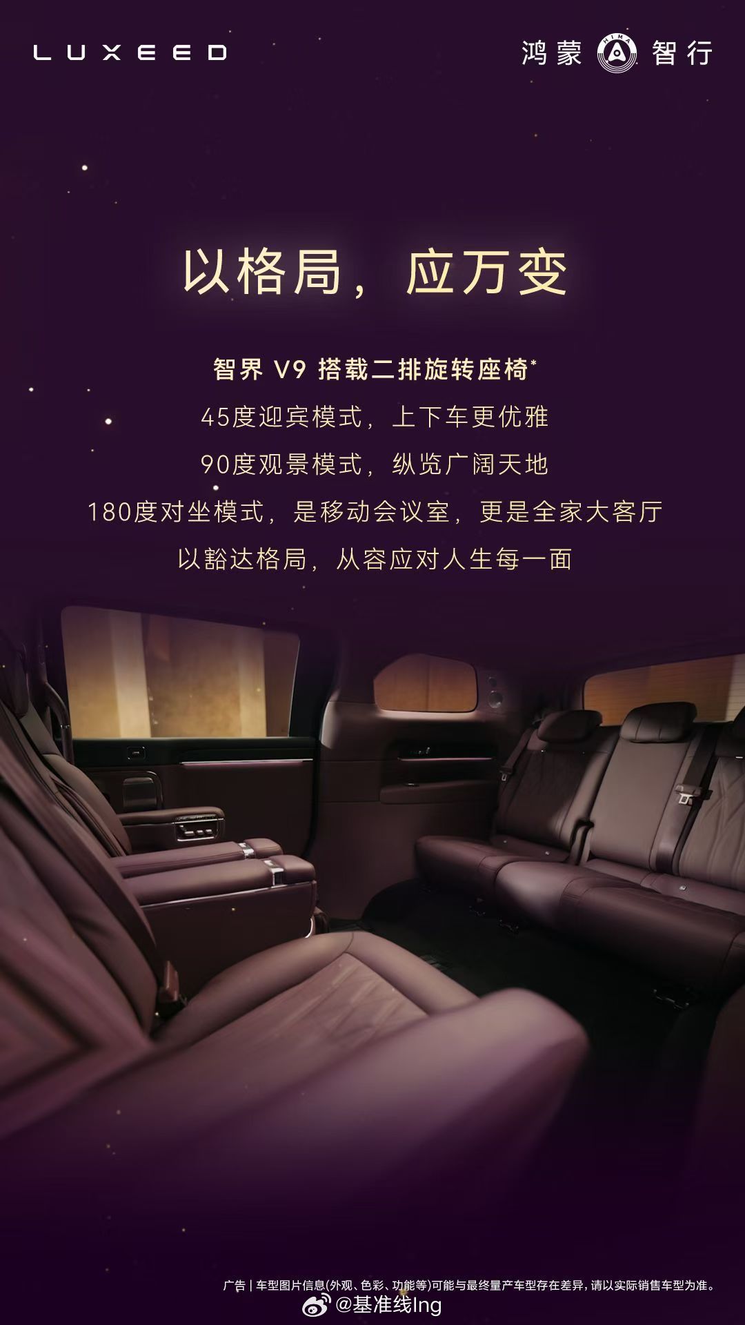 智界V9,外展气度,内蕴万象。首发绒霞紫内饰,静奢质感,触手可及;搭载二排旋转座
