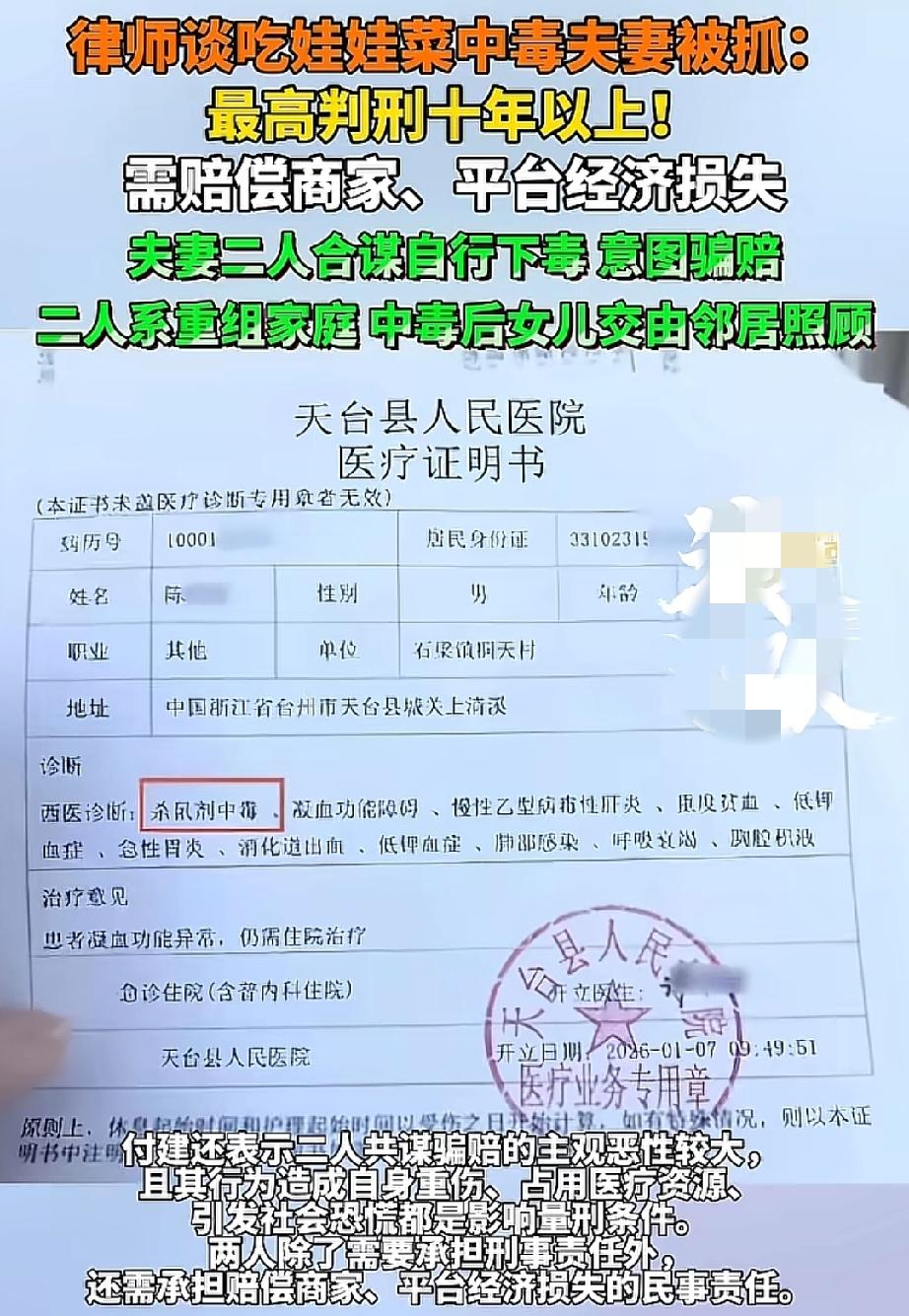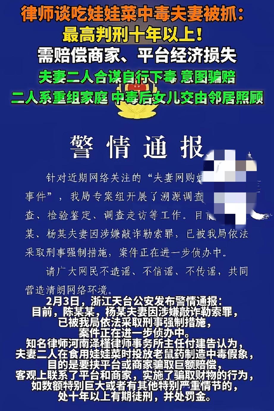 娃娃菜风波这是最后一波反转了吧,夫妻双双进去了,可怜的女儿由别人照顾了。 一开始大家以为是包娃娃菜的报纸有毒,后来是说女人的丈夫投毒的,最后结果是夫妻两个自导自演的,俩人居然心不跳脸不红的导演了这场好戏。 这俩夫妻的价值观真是扭曲,需要赔偿娃娃菜商家和平台不说,把自己弄进ICU也不嫌自己受罪。娃娃菜