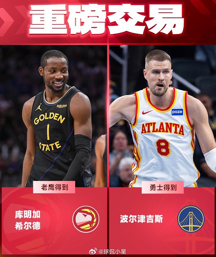 据名记Shams报道,勇士将库明加和希尔德交易至老鹰,换来波尔津吉斯。