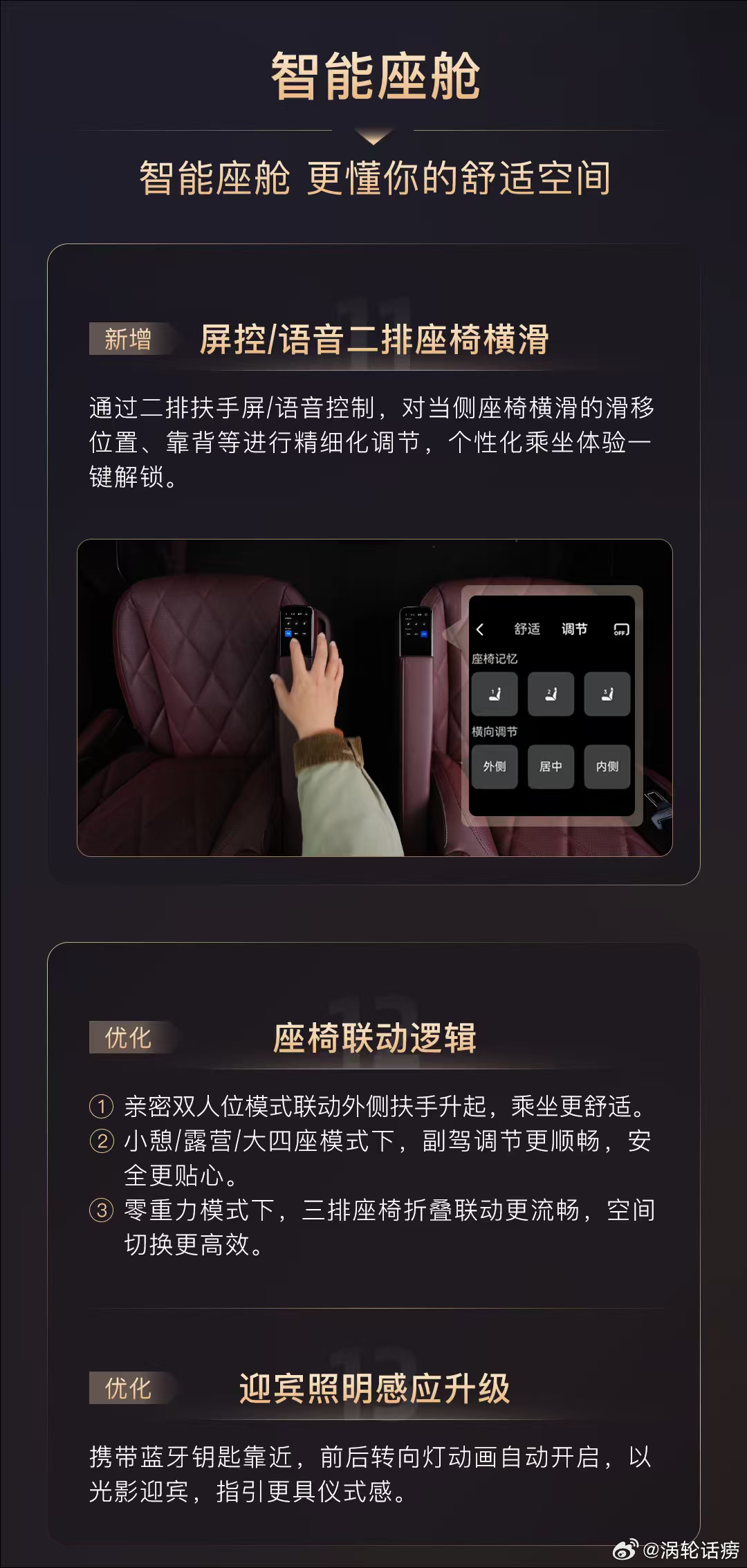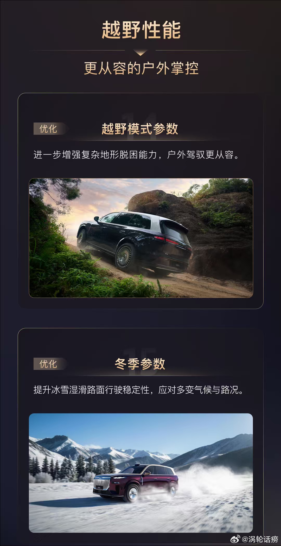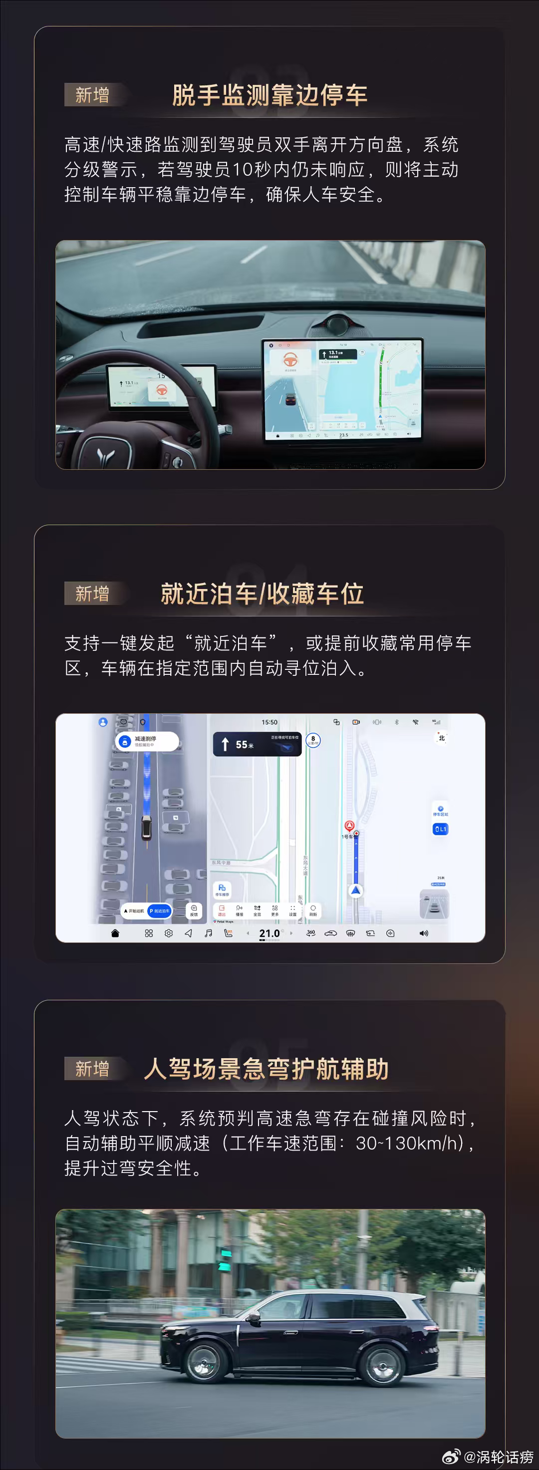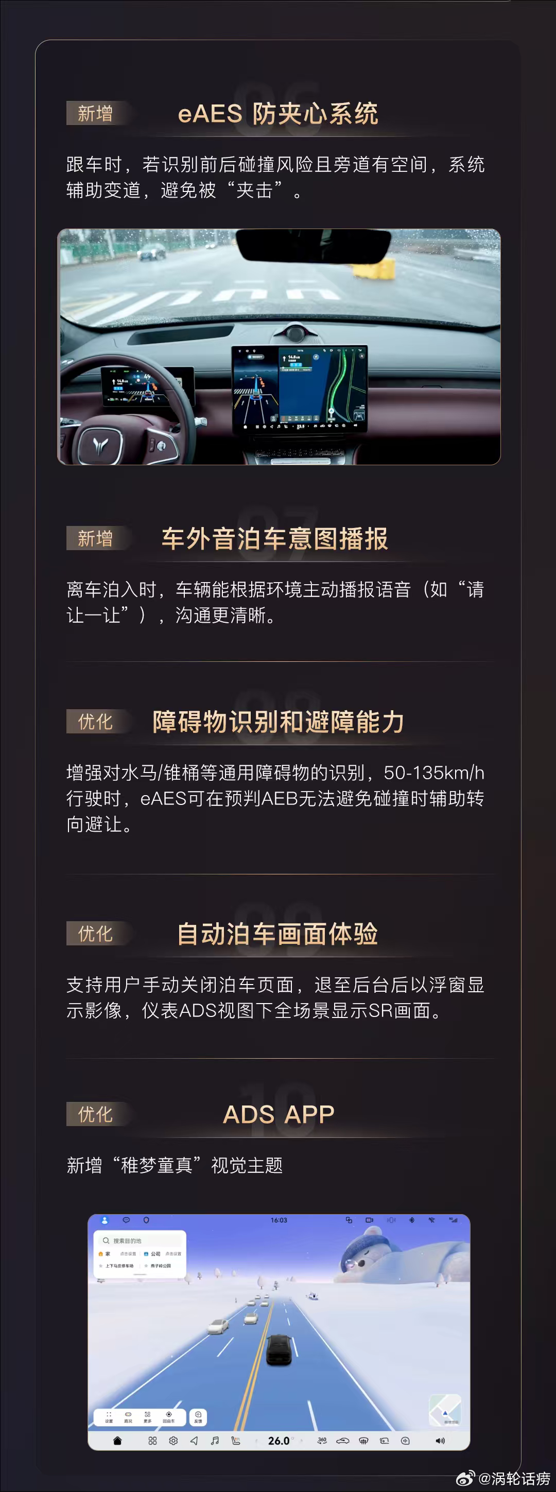 岚图泰山 OTA 2.5 重磅升级,三大维度同频跃升,带来全维度焕新体验!✅辅助驾驶更全面 → 全面升级华为乾崑智驾ADS 4.1,实现七大新增三大优化📍七大新增1️⃣NCA覆盖复杂道路:领航辅助新增乡村/山区等复杂路况场景,驾驭更从容。2️⃣城区NCA三点式掉头:狭窄路口自动调整,完成掉头。3️⃣脱手监测靠边停车:高速/快速路监测到驾驶员双手离开方向盘,警示后若驾驶员10秒内仍未响应,主动靠边停车。4️⃣就近泊车/收藏车位:支持“就近泊车”或收藏车位自动寻味泊车。5️⃣人驾场景急弯护航辅助:人驾状态,系统预判高速急弯风险,自动辅助减速,提升过弯安全性。6️⃣eAES 防夹心系统:跟车时,若识别前后碰撞风险且旁道有空间,系统辅助变道,避免被“夹击”。7️⃣车外音泊车意图播报:离车泊入时,车外音主动播报泊车意图。📍三大优化1️⃣障碍物识别和避障能力:50-135km/h行驶时,eAES可时辅助转向避让。2️⃣自动泊车画面体验:支持用户手动关闭泊车页面,退至后台后以浮窗显示影像,仪表ADS视图下全场景显示SR画面。3️⃣ADS APP:新增“稚梦童真”视觉主题。✅车内空间更舒适 → 智能座舱升级优化📍新增屏控/语音二排座椅横滑二排座椅可通过扶手屏 / 语音,精细化调节横滑、靠背位置,解锁个性化乘坐体验。📍优化座椅联动逻辑支持不同模式切换座椅体验,切换更流畅、乘坐更舒适、安全更贴心。📍优化迎宾照明感应升级携带蓝牙钥匙靠近,前后转向灯动画自动开启,以光影迎宾,指引更具仪式感✅户外掌控更从容 → 越野性能再升级📍优化越野模式参数:增强复杂地形脱困能力,户外驾驭更从容。📍优化冬季参数:提升冰雪湿滑路面行驶稳定性,应对多变气候与路况本次OTA升级,从智驾到座舱再到越野,从舒适度到安全性,岚图全方位提升用车体验。车主快快更新起来吧,开启全新驾驭感受!