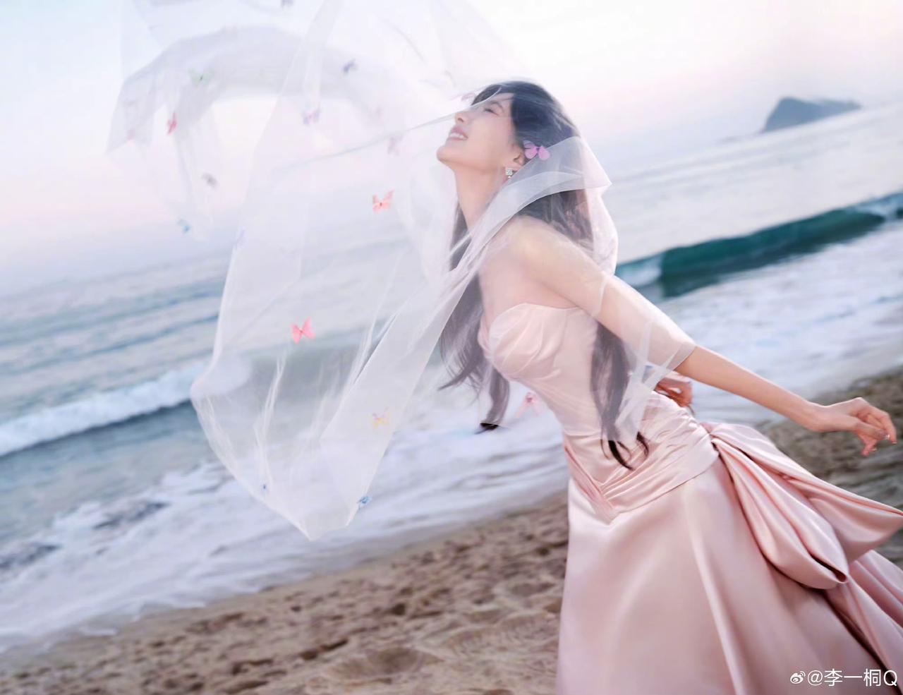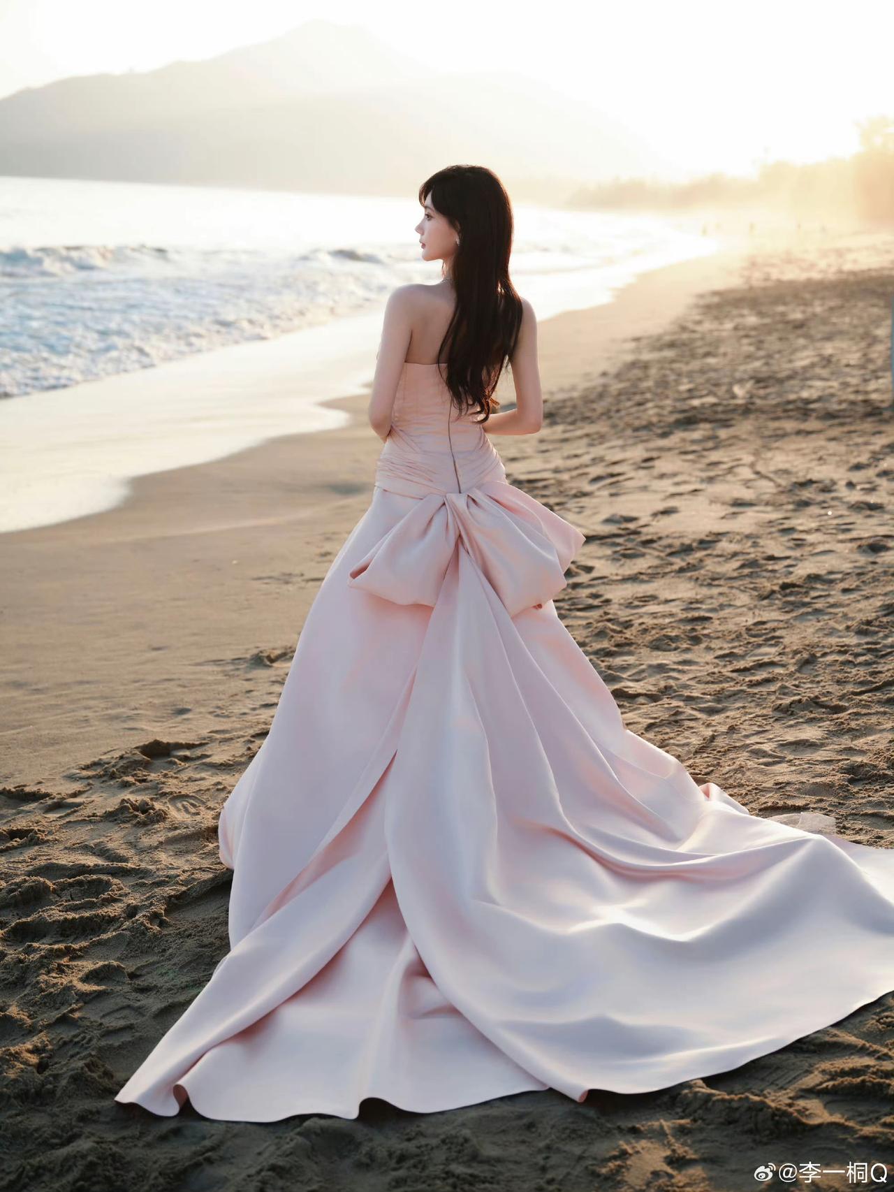 一位美女坐在沙滩上,穿着长裙,好漂亮!