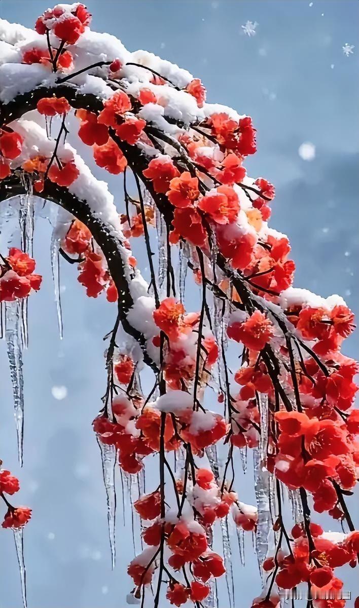 冬景吟 雪中红梅傲冷霜,枝摇艳影韵流芳。 寒苞绽处香盈径,瘦蕊开时梦绕廊。 冰挂垂檐如剑耸,琼花缀树若星藏。 山川素裹呈佳象,冬日风光入画囊。 冬日之际,雪中红梅傲然绽放,那一抹艳红在皑皑白雪的映衬下,愈发夺目,宛如寒冬中燃烧的炽热火焰。冰挂更是独具特色,晶莹剔透地垂挂着,好似锋利的长剑,又宛如精美的艺术珍品。这般绝美之景,宛如一幅天然画卷,令人沉醉其中。 红梅迎冬雪 带雪诗句 腊梅诗 瑞雪红梅映岁暖