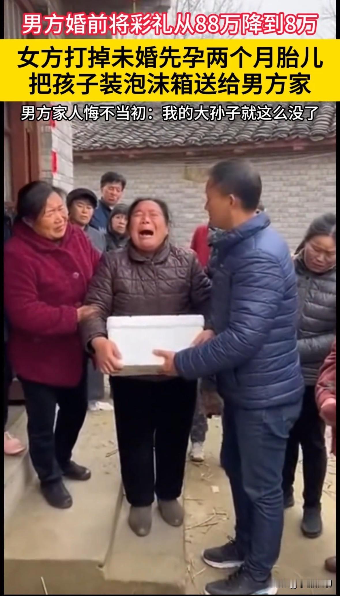 这事到底怨谁呢? 因女孩结婚前就怀孕了,男方以为可以随便拿捏女孩,彩礼一降再降,最后女孩一气之下,去医院打掉了未婚先孕的两个月大的胎儿,并把胎儿装到泡沫箱里送到男方家里。 男方的老两口看到后,抱着泡沫箱痛哭流涕,悔不该当初,但是为时已晚。 你们那边有因未婚先孕而被男方拿捏的吗?