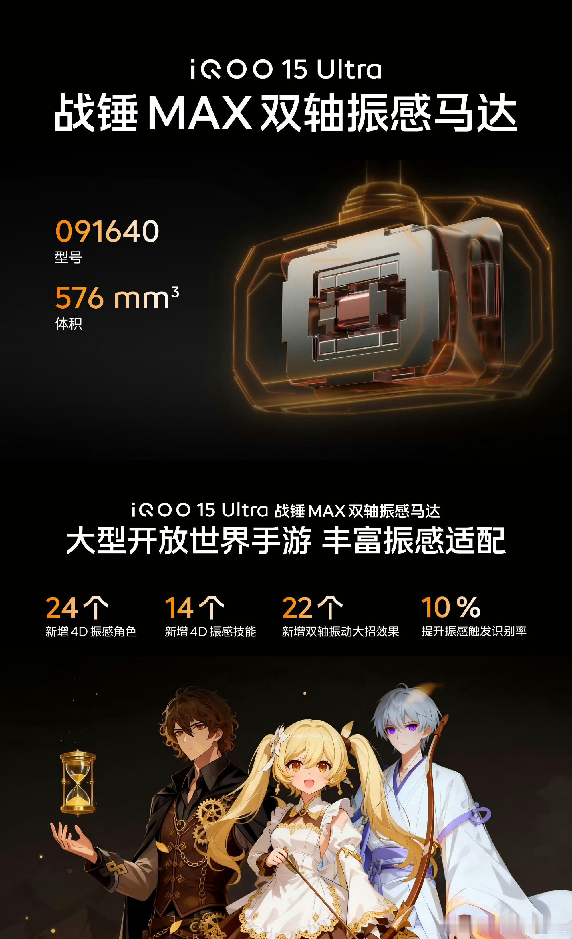 iQOO15 Ultra扬声器、马达和光效:搭载了同轴对称双扬声器,支持杜比全景声,三维环绕声场;双轴振感马达,576mm³的091640马达;12种色彩调节。