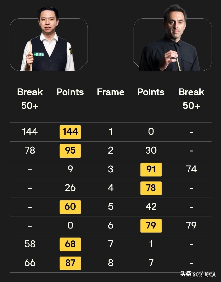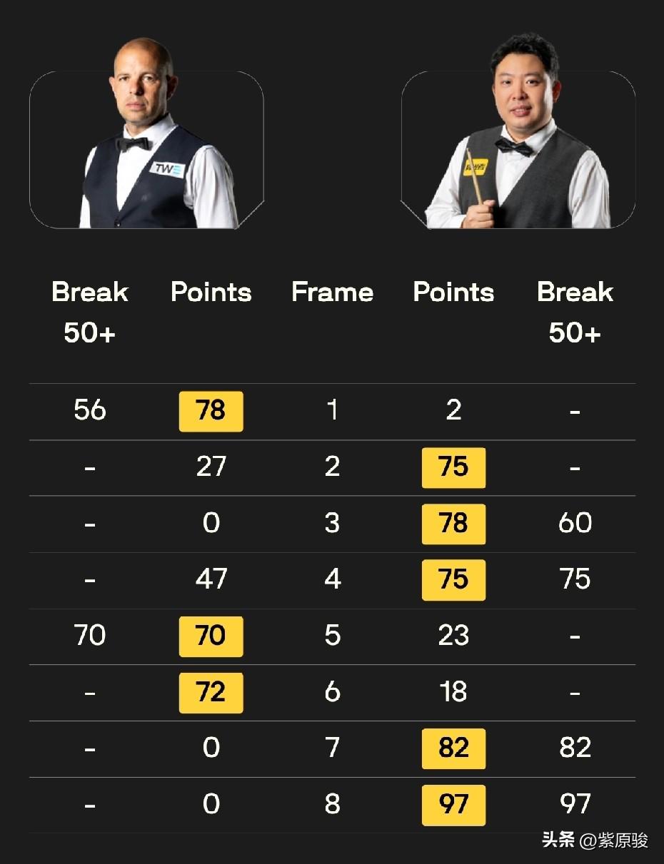 世界大奖赛第二轮战报,肖国栋5-3胜火箭奥沙利文,张安达5-3胜霍金斯,斯佳辉5-3胜庞俊旭,韦克林5-4逆转绝杀斯莱瑟。由于1/4决赛有两场中国德比,这就意味着至少有两名中国球员已经提前锁定4强席位。 世界大奖赛第二轮今天下午时段的比赛刚刚结束。最受关注的肖国栋对火箭的比赛,最终肖国栋5-3获胜。这场比赛,总的感觉,双方发挥不算好,肖国栋专注度不够,可能跟火箭打比赛,有一定压力,不过肖国栋的稳定性非常好,而火箭的失误较多,尤其是防守。最终肖国栋5-3获胜。 现在的火箭因为年龄关系,参加比赛不多,输球正常。 值得一提的肖国栋第一局打出单杆144分,是目前单杆最高分。肖国栋1/4决赛的对手是斯佳辉。 另一场中国球员的外战比赛,张安达3-1领先前4局后被霍金斯连追两局。之后张安达顶住压力,连赢两局,5-3获胜。张安达1/4决赛的对手是吴宜泽与常冰玉之间的胜者,后者的比赛晚上进行。 庞俊旭在与斯佳辉的中国德比中0-4落后,之后连追3局。第8局,斯佳辉拒绝逆转,在庞俊旭拿到56分的情况下,62-56逆转,总比分5-3获胜。 下午时段的另一场比赛,韦克林5-4逆转绝杀斯莱瑟。这场比赛,韦克林比较悲催,两局均被逆转,其中第一局75-77,第6局61-64。好在第7局和第8局韦克林拿下。决胜局,韦克林抓住斯莱瑟的两杆进攻失误,完成超分。刚超分,斯莱瑟就从座位上站起来跟韦克林握手认输。 今天19点,第二轮将进行4场比赛,4名中国球员出战,其中一场德比,具体赛程如下: 吴宜泽vs常冰玉 赵心童vs塞尔比 袁思俊vs卡特 周跃龙vs杰克·琼斯。 中国球员,加油!