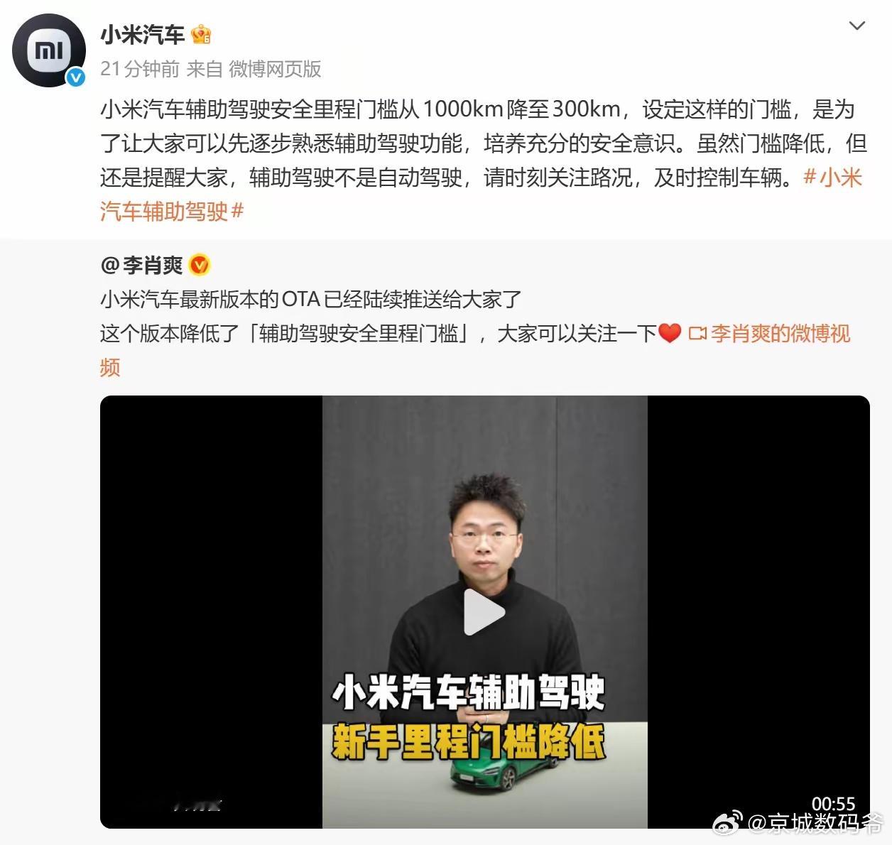 小米汽车将辅助驾驶安全里程门槛降至300公里我还是建议不要降,甚至还要增加些…