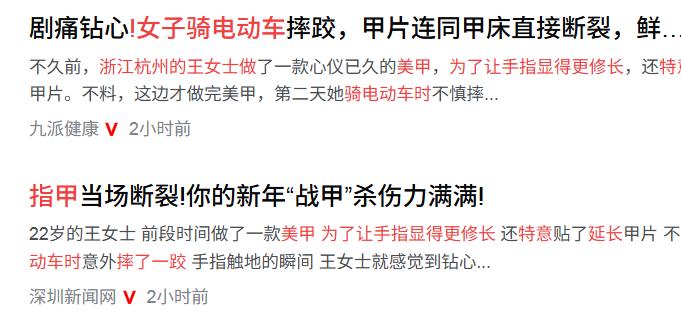 “悲剧还是发生了!”近日,浙江杭州,一女子为了让手指显得更修长,在做美甲时特意延长指甲,不料骑电动车不小心摔了一跤,因为美甲太长,导致指甲掀翻,手指直接骨折,疼得她哇哇直叫!医生:如果不做美甲,伤害根本不会这么严重! 杭州的王女士怎么也没想到,自己为了迎接春节特意定制的“延长甲”,竟然成了一场微型灾难的导火索。前一秒,她还在为修长指尖带来的精致感沾沾自喜,后一秒,这双原本用来展示美的手,却被裹上了厚厚的纱布。 就在数日前,为使手指尽显纤细之态,她精心挑选了甲片。那甲片较原本甲床长出许多,宛如为指尖添了一抹别样风情。 这种修饰确实赏心悦目,但在物理学面前,它就是一个危险的杠杆。那天她骑着电动车行驶在杭州街头,车轮碾过一颗不起眼的小石子。车身失衡的瞬间,人的求生本能接管了身体——她下意识地伸手去撑地面。 因为那几片坚硬的延长甲,接触地面的瞬间,指尖并没有成为缓冲点,反而变成了一个坚硬的支点。巨大的冲击力顺着这个“支点”反噬回来,如同撬棍一般,瞬间撬开了她的甲床。 剧痛钻心。王女士低头看时,左手食指的甲片连同甲床已经被生生掀翻,鲜血淋漓。送到医院一查,不仅是软组织撕裂,指骨也断了。接诊医生的判断很直接,甚至带着点无奈:“如果不做这个美甲,这就是一次普通的摔跤,绝不至于骨折。” 把时间轴拉回今年1月8日,云南大理。一位女士在厨房削土豆时,长长的美甲不偏不倚卡进了削皮刀的缝隙里。这听起来像个段子,但现场情况尴尬又危险——进退两难,手指被死死锁住。最后不得不请来消防员,动用专业破拆工具,才把她的手从土豆和刀具的“夹击”中解救出来。 这些案例都在指向同一个被忽视的真相:过度的修饰,正在剥夺手部最基础的生存功能。我们在追求“指尖盛宴”的时候,往往忘了手是用来生活的,不仅仅是用来展示的。当指甲的长度超过了生理的极限,它就不再是身体的一部分,而是一个随时可能失控的异物。 医生给出的建议其实非常具体,甚至可以说是一条“安全红线”:甲片长度最好不要超过自然甲床的五分之一。一旦超过这个比例,力学结构就会发生质变。特别是在骑行、球类运动这些高动能场景下,长指甲就是一颗定时炸弹。 但如果这份美需要以骨折、流血甚至手术为代价,那这个“春节战甲”的成本,未免有些太高了。下次坐在美甲店的椅子上时,不妨想一想:你需要的究竟是一双惊艳的手,还是一双在摔倒时能保护你的手?