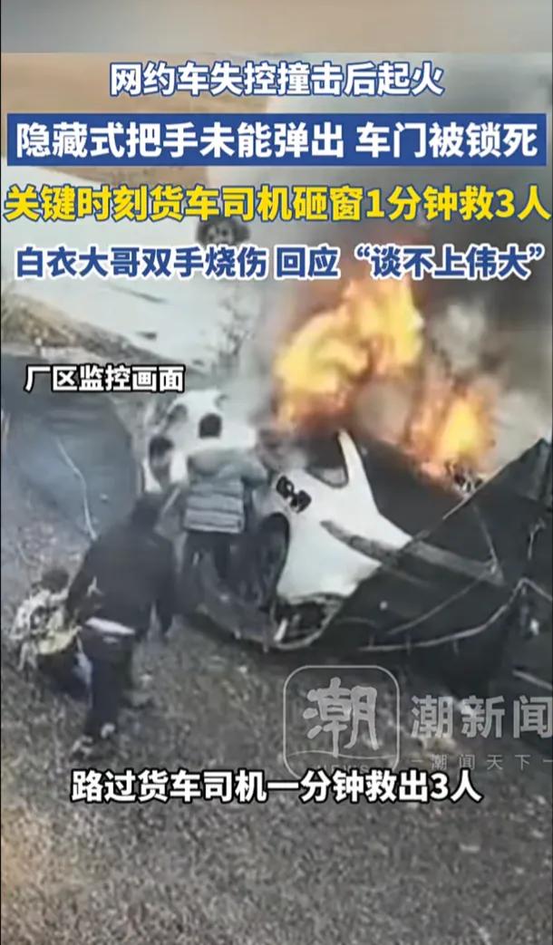 云南一网约车失控撞击起火,副驾1人遇难,后排乘客3人获救,隐藏式把手被锁,路过白衣大哥砸车窗救人,双手三度烧伤。 监控画面里,白色网约车像脱缰的野马狠狠撞向路边围挡,车头瞬间扭曲变形,黑烟裹着火星子往外冒。路过的货车司机,也就是大家口中的白衣大哥,刚把车停稳就捡起地上的石头冲了过去。车门因为变形加上隐藏式把手失灵根本打不开,他只能铆足劲往车窗砸,玻璃碴子混着滚烫的火星子往他手上钻,疼得他直咧嘴也没停。 先拽出后座吓得发抖的乘客,前后不过一分钟拽出3个人,他想回头再拉副驾驶的人时,火舌已经吞了大半个车厢,热浪逼得人根本没法靠近。事后他躺在病床上,缠着厚厚纱布的手连筷子都握不住,面对镜头只反复说那句“我尽力了”。 这事让人揪心的不只是生死瞬间,还有隐藏式把手在事故里的致命缺陷。平时看着美观又高级的设计,真到了撞车断电的紧急时刻,就成了困住生命的枷锁。不少网友翻出过往案例,类似的事故里,因为隐藏式把手弹不出来耽误救援的不在少数。车企追求颜值和科技感的同时,是不是该多留个心眼,给安全留条兜底的后路? 更让人动容的是,白衣大哥拼着双手烧伤救了人,却因为没能救出最后一个而陷入自责。换作任何一个人,在那样的高温和浓烟里,能做到这份上已经是拿命在拼。他不是天生的英雄,只是在关键时刻选择了挺身而出,用血肉之躯为素不相识的人筑起一道防线。这份朴素的善良里,藏着普通人最动人的担当,也让我们看到了人性里最耀眼的光芒。 我们总在说科技改变生活,却忘了所有的设计都该给安全让路。也希望更多人记住这位白衣大哥,他的勇敢和善良值得被所有人看见、被所有人赞扬。正是因为有这样的凡人英雄,我们的生活才多了一份温暖与安心。 各位读者你们怎么看?欢迎在评论区讨论。