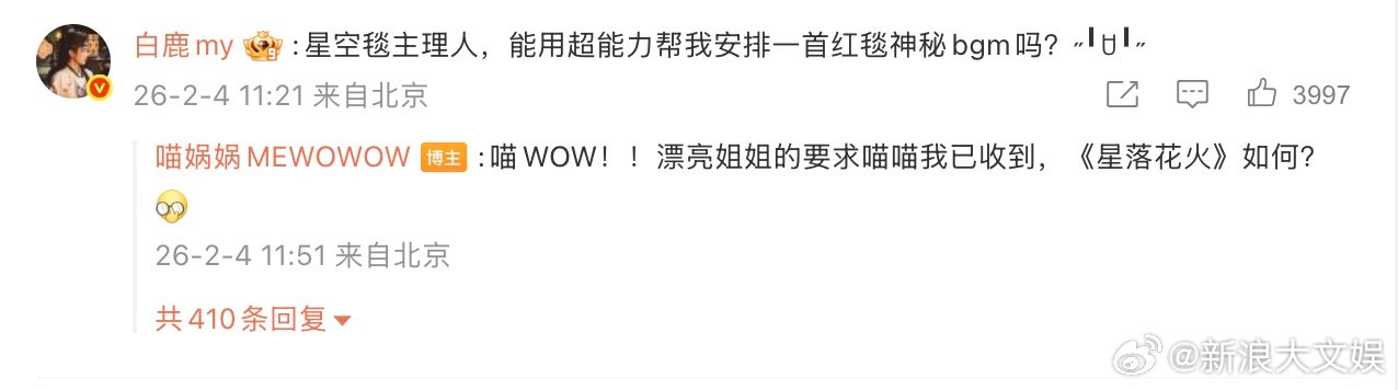 白鹿想要红毯BGM白鹿就得到 赛博许愿,在线灵验!喵小金才不是光说不做呢!说好要实现帅哥美女们的愿望,这不就行动了,想要的专属红毯BGM安排上!不得不说这只神兽是真的有点东西~