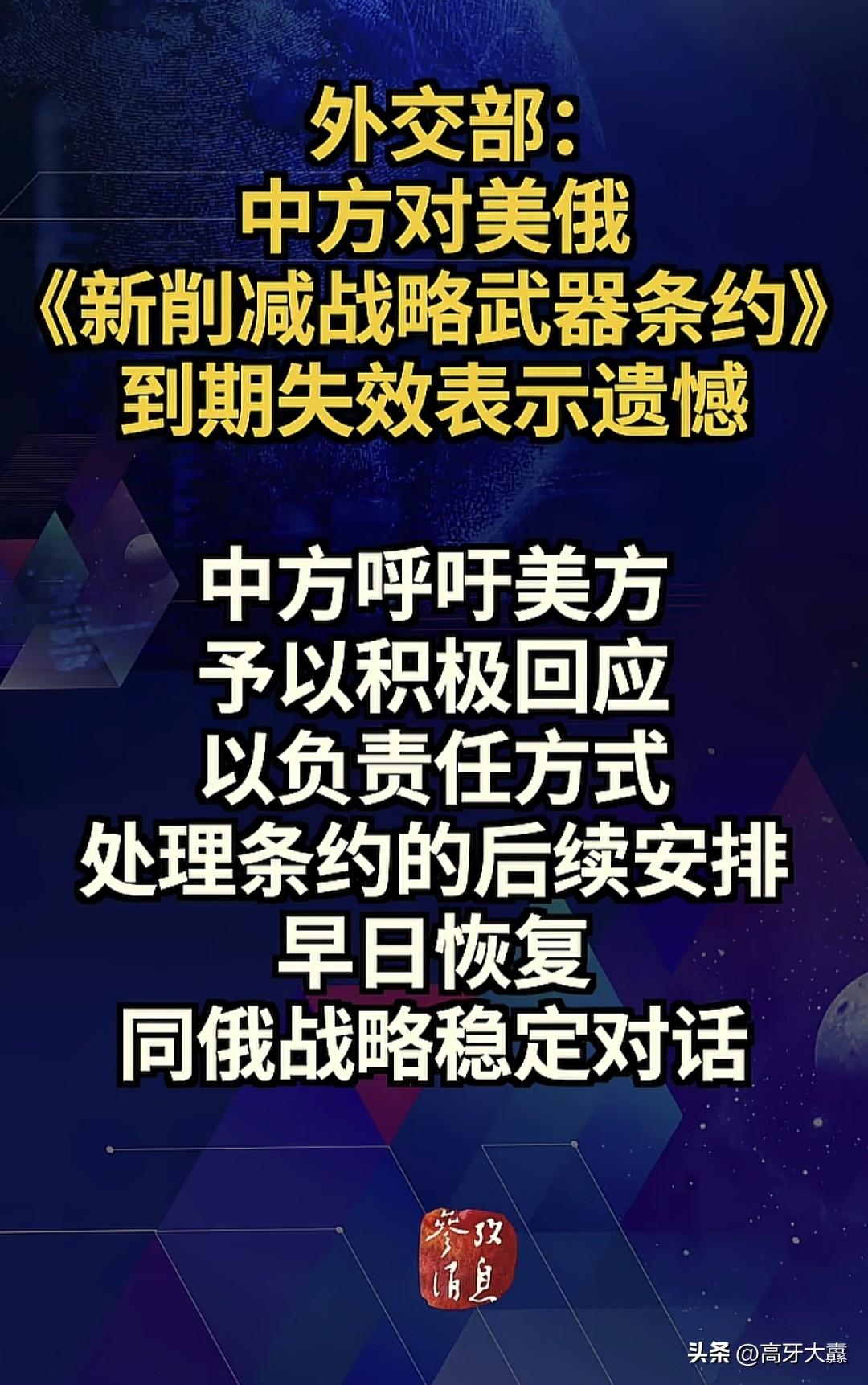 今天,中国外交部就美俄《新削减战略武器条约》到期失效一事表态,中方对此表示遗憾,并呼吁美方积极回应,以负责任的方式处理后续安排,早日恢复与俄罗斯的战略稳定对话。 这一条约的失效,不仅是美俄双边关系的重大倒退,更是全球战略稳定体系的一次“大地震”。作为目前全球仅存的军控条约,它曾是维系美俄核平衡、防止军备竞赛的关键支柱。它的终结,意味着世界正式进入了一个没有主要核军控协议约束的危险新阶段。