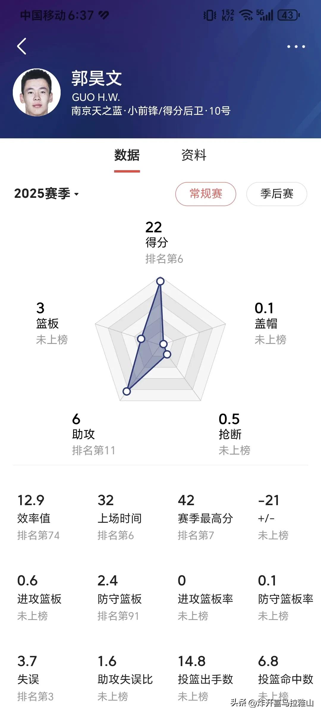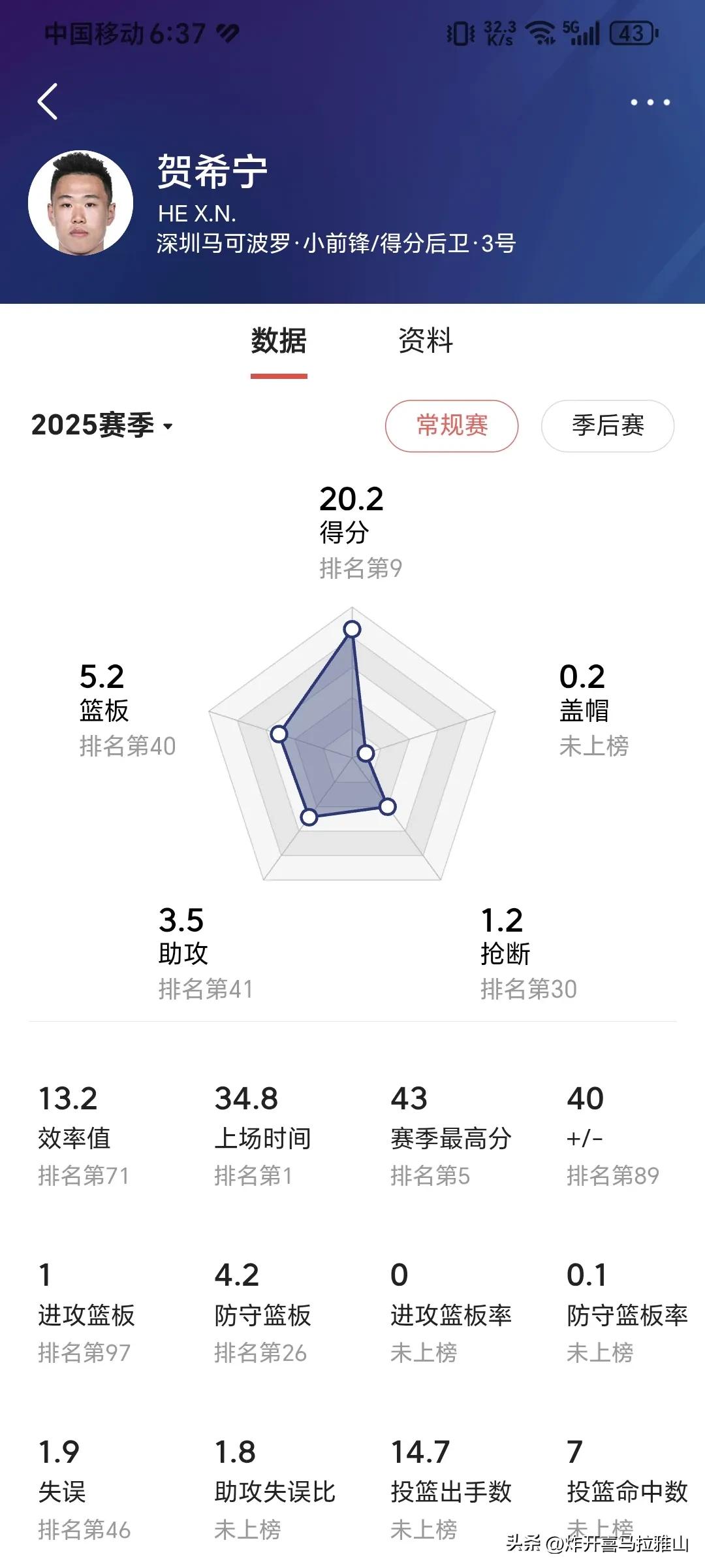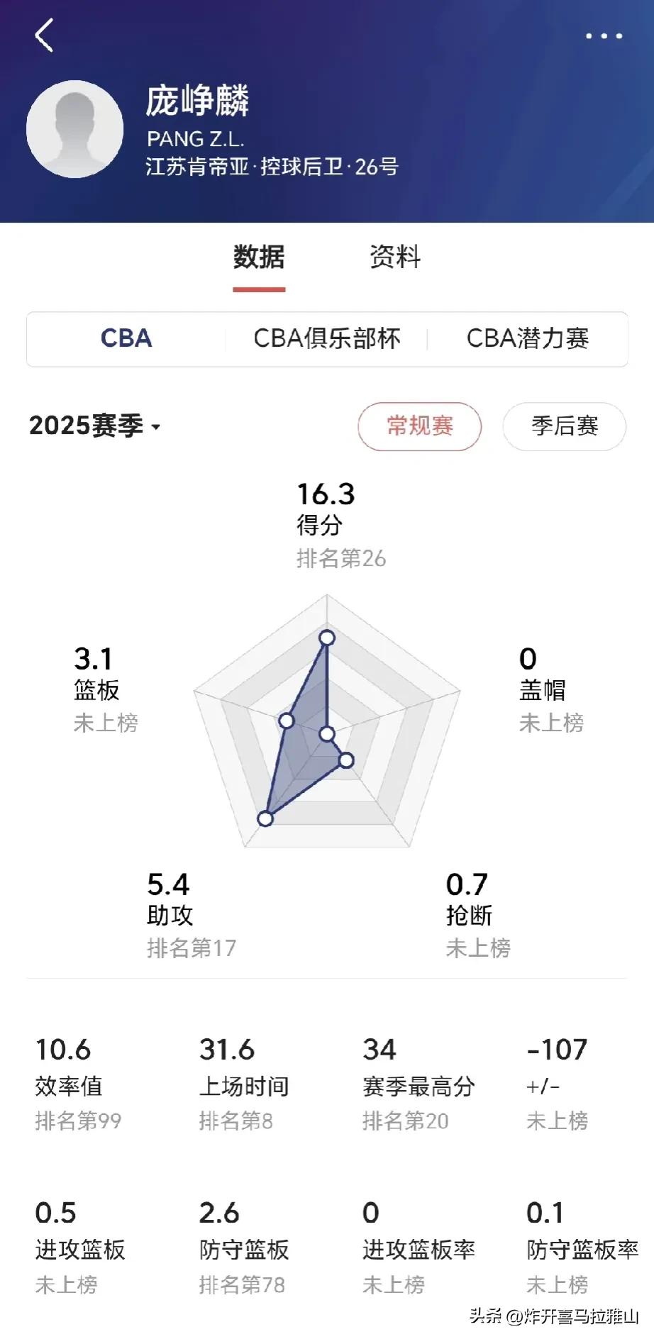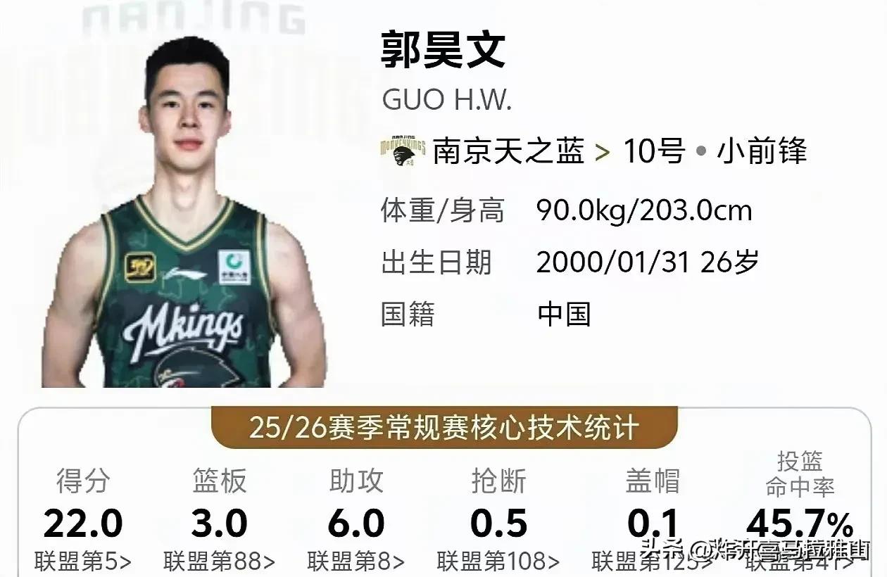 CBA第一阶段结束,给我印象深刻的有这三个球员。 1、庞铮麟,他的第一个CBA赛季太惊艳了,把很多国手给比下去,目前场均16.3分,3.1篮板,5.4助攻,表现非常全面,可以说江苏队淘到宝贝了,如果给他配个好点的外援,江苏队崛起也是没有问题的。 要知道庞铮麟去年还在打野球场,今年就进了CBA,还进了国家队,进步程度可以说是坐上火箭了! 2、贺希宁,场均20.2分5.2篮板3.5助攻,已经成为球队的进攻核心。贺希宁禁不住比能打关键球,而且还都能打进,在深圳队他的作用比外援还重要。他的这些数据是实打实的打出来的,不像某些球员靠垃圾时间刷分刷出来的。 3、郭昊文,本赛季场均出战32分钟,能够得到22分3板6助,暂为本土得分王。他打一号位没有能和他对位上的人,总是能够错位打,本赛季他的三分球投篮进步明显,唯一遗憾的是没有能进男篮集训,他的能力打亚洲球队肯定是砍瓜切菜的容易。