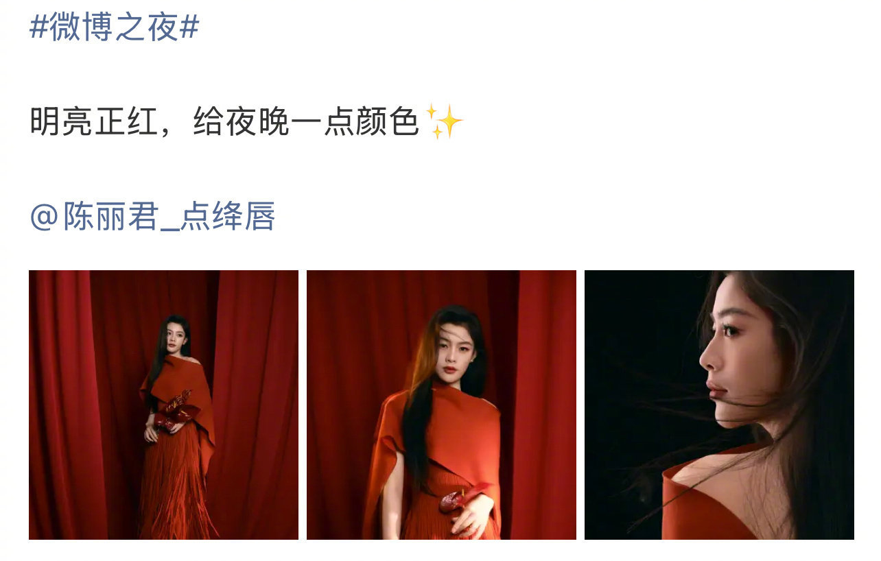 陈丽君给微博之夜一点颜色陈丽君给微博之夜一点颜色,一身红袍明媚耀眼!!美到挪不开眼的程度啊
