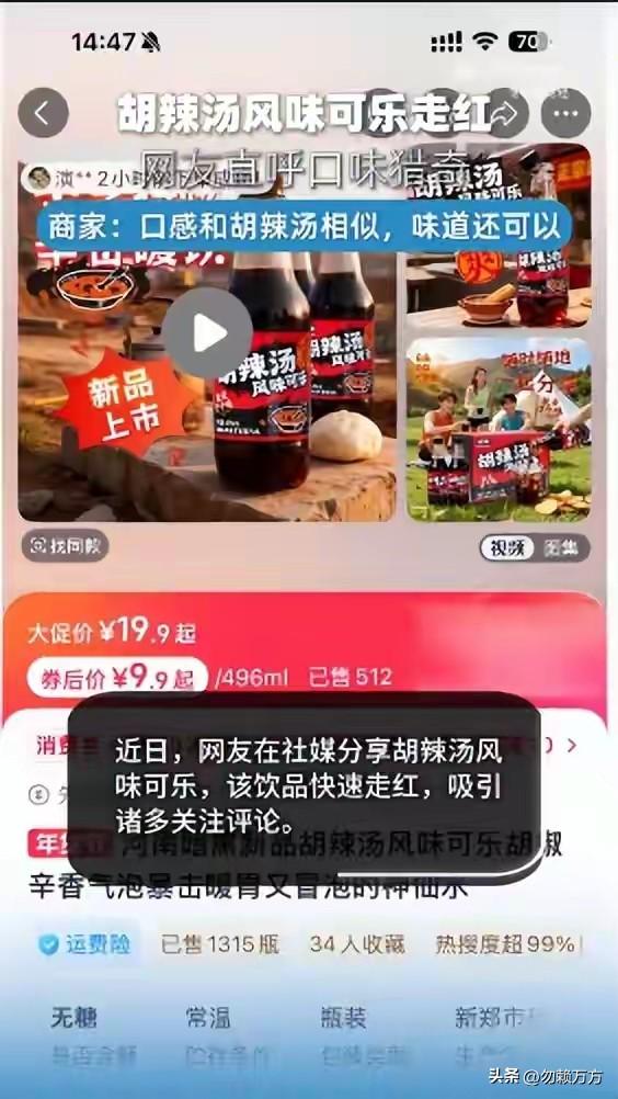 胡辣汤味可乐,这才是真的脑洞大开,完全风马牛不相及的两种东西被硬拉到一起,还有不少人愿意猎奇捧场,真是心有多大舞台就有多大啊。[大笑] 我是河南人,但是让我花十块钱喝碗胡辣汤我也不太愿意,可乐就更别提了,所以这种生硬嫁接又高价的猎奇产品真能长久么?