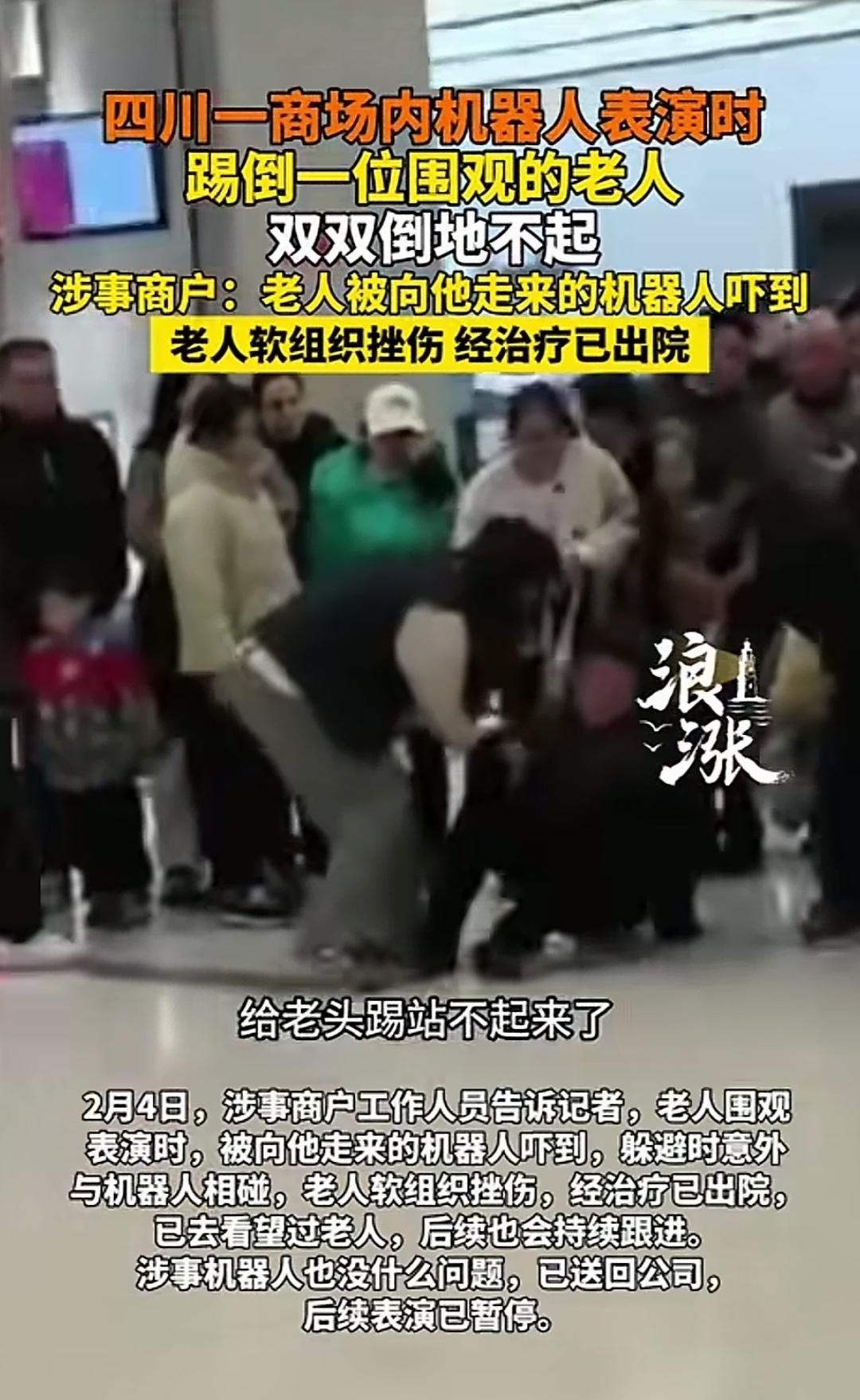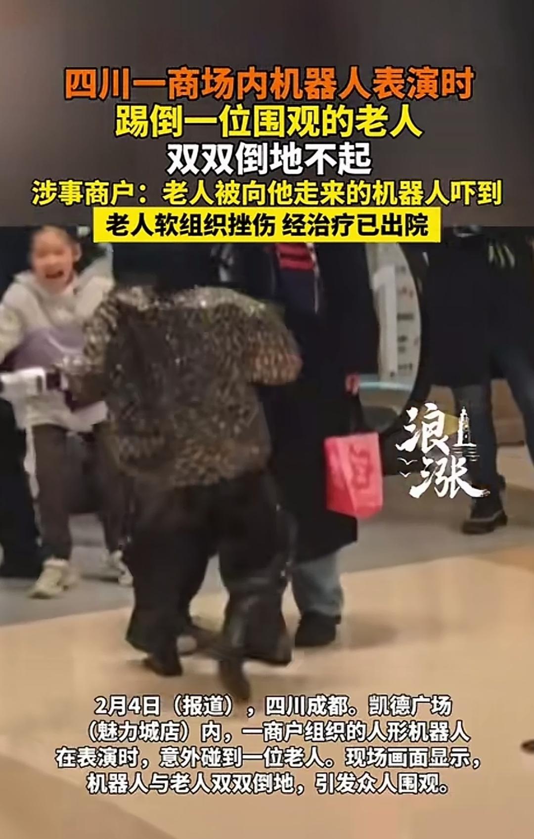 参与表演的机器人,没把控好动作,将在场围观的老人踢倒在地。见老人倒地不起,它竟也学样,赖在地上不动了! 2月4日,有媒体发布视频称,在四川成都一凯德广场(魅力城店)内,一商户组织的人形机器人表演时,意外撞到一位老人。 现场画面显示,机器人与老人双双倒地,引得众人围观,有人不禁感叹:机器人都学会学人耍赖不起了,照此发展下去,恐怕人类都难以控制机器人了! 机器人倒地