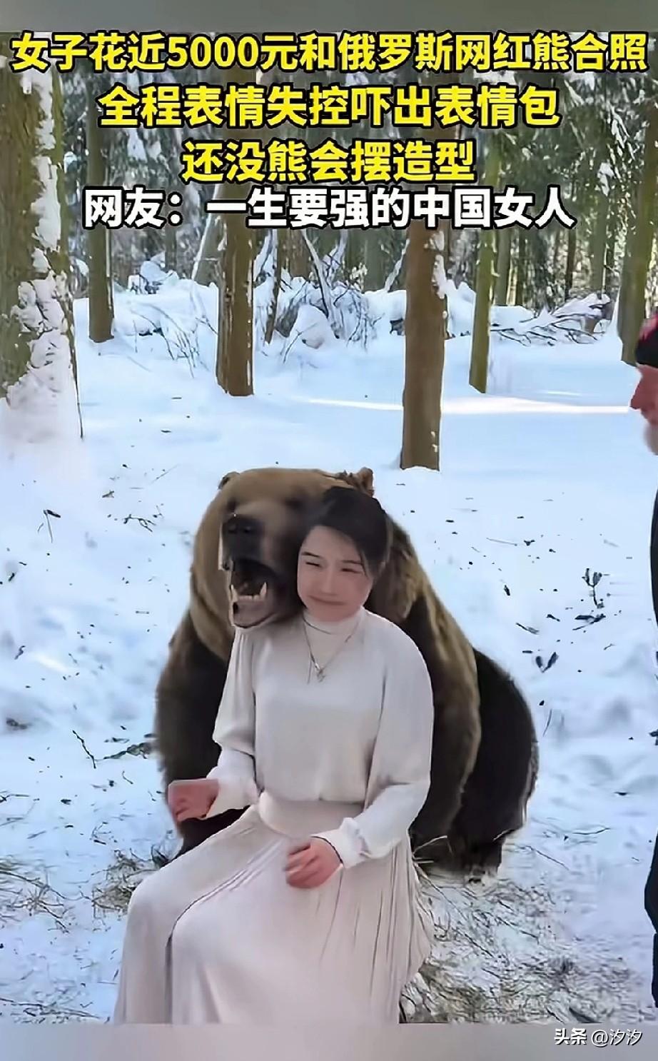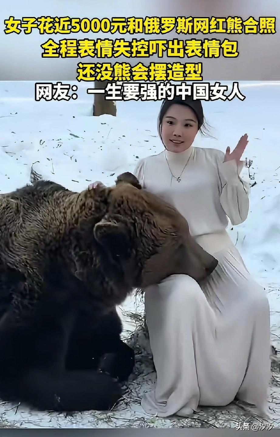 中国女子花5000元和网红熊合影, 全程被吓出了表情包, 工作人员在旁边一直安慰