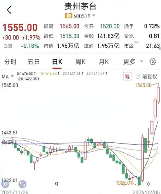 2026年2月5日,贵州茅台(600519.SH)股价逆势上行2%,收盘报1555元/股,总市值约1.95万亿元,创9个月以来新高,这也是公司自2025年3月14日(当日市值达2.05万亿元)后,市值首次回归该规模。此次市值回升,恰逢春节消费旺季,茅台全系产品市场需求迎来显著激增。 终端市场方面,茅台产品呈现紧俏态势,i茅台App因访问流量过大出现页面加载故障,茅台证券部对此证实,当前公司产品终端处于“一瓶难求”的市场状态。价格走势上,2026年53度500ml原箱飞天茅台批发价攀升至1660元/瓶,零售价约1750元/瓶;1月30日该款产品价格出现大幅波动,批发价单日跳涨100元,散瓶价单日上涨80元。得物App数据显示,近30日53度500ml飞天茅台成交均价为1764元/瓶,1月31日成交价触及1813元/瓶的阶段高点。 从市场动向与机构研判来看,当前资金面呈现明显分歧:尽管自1月29日起,茅台股价累计反弹17.5%,跑赢A股市场98.6%的个股,但公司融资余额已连续5日下滑,2月4日单日遭融资客净抛售11.72亿元,创历史新高。投资端有重要动向,段永平于1月27日斥资1.03亿元,以1329-1331元/股的成本价买入7.72万股贵州茅台。 渠道调研数据显示,招商证券实地调研反馈,河南、安徽、四川等核心消费区域经销商动销情况超市场预期,春节前已完成全年销售目标的25%-30%,渠道库存处于低位水平。券商研报层面,中金公司认为,飞天茅台批价已围绕1500元/瓶形成市场共识区间,价格筑底信号明确;中银证券则发布研报提示,白酒行业目前仍处于深度调整周期,行业马太效应持续加剧,市场分化态势进一步凸显。