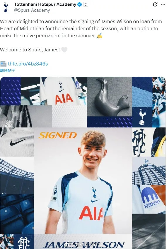 官方:热刺宣布从哈茨租借签下了詹姆斯-威尔逊,交易包含选择性买断条款。