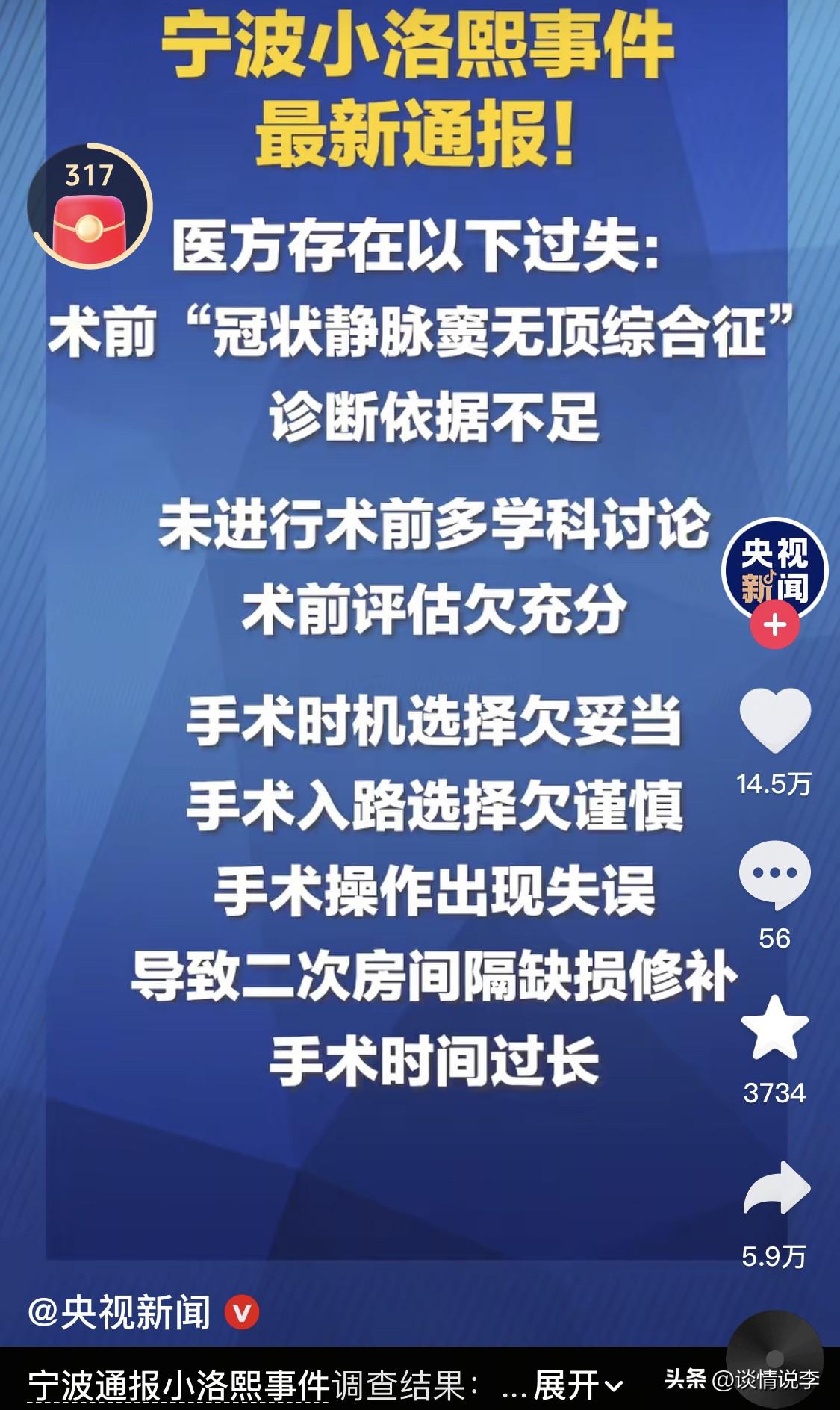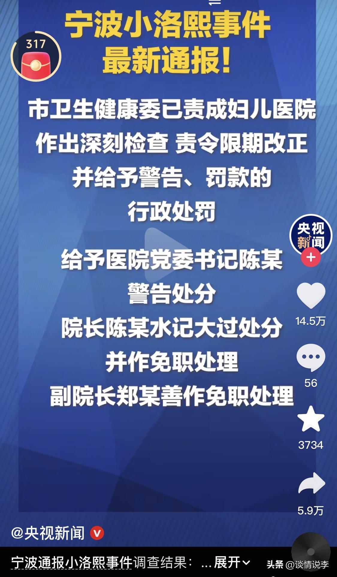 年仅5个月的小洛熙终于等到了…… 深爱她的爸爸妈妈和家人,终于等到了一束光。然而,意难平……意难平…… 调查结果密密麻麻,看不懂,也没心情看。 只看到了一个重点:这是一起一级甲等医疗事故。手术时机选择欠妥,操作出现失误。 大家看一下责任人的处理结果: 主刀医师陈某贤被免去外二科主任职务,麻醉医师严某雅被免去麻醉科主任职务,陈某贤医师执业证书被吊销,PICU医师董某亚被暂停执业活动6个月。同时这三个人被给予警告、罚款的行政处罚。 宁波大学附属妇女儿童医院院长陈长水被记大过并免职,副院长郑某善免职。 只是警告、罚款、免职,是不是太轻了! 想安慰小洛熙的妈妈,却感到语言是如此苍白,不知道说什么了。希望小洛熙的家人都好好的,向前看。