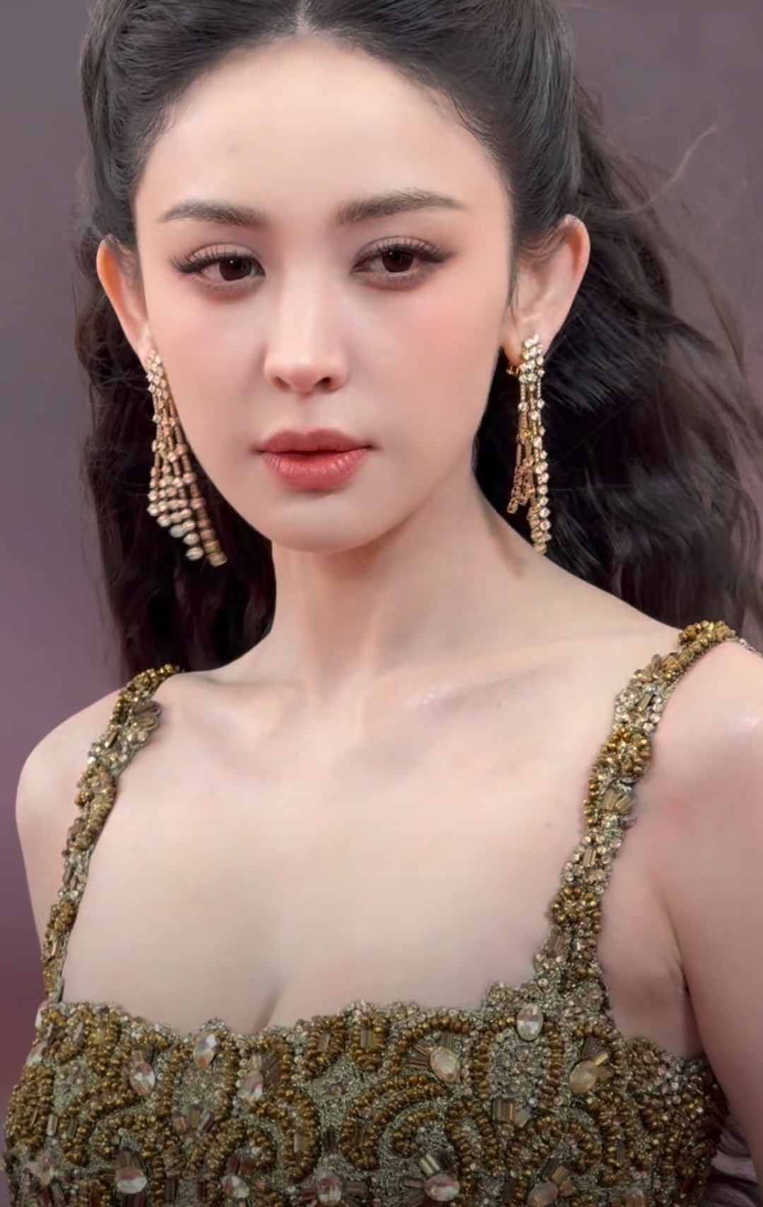 还有那张仰拍图!领口的位置本来就低,仰拍角度直接把肩颈和胸口的细节放大,连肩带的闪钻都看得清清楚楚。
