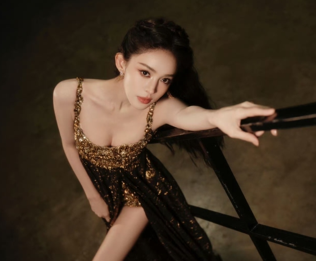 低胸设计+开到大腿根的高开叉,本来就够让人提心吊胆,结果姿势还这么敢。