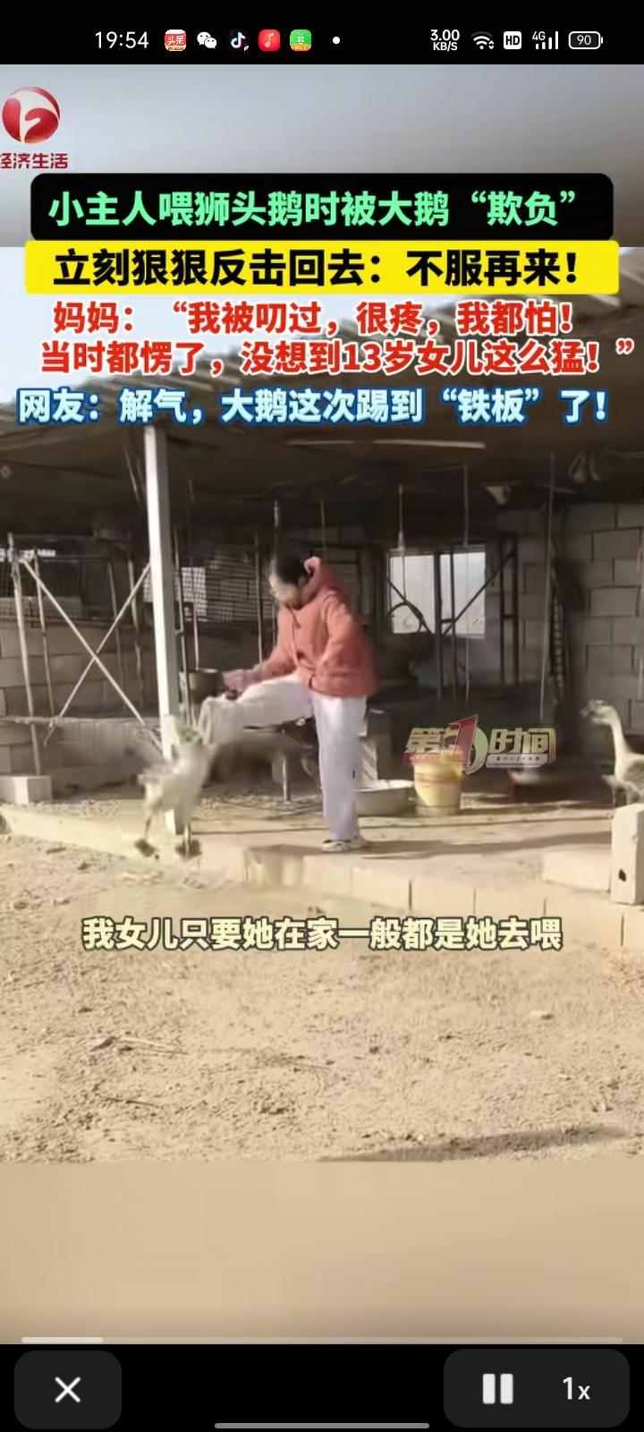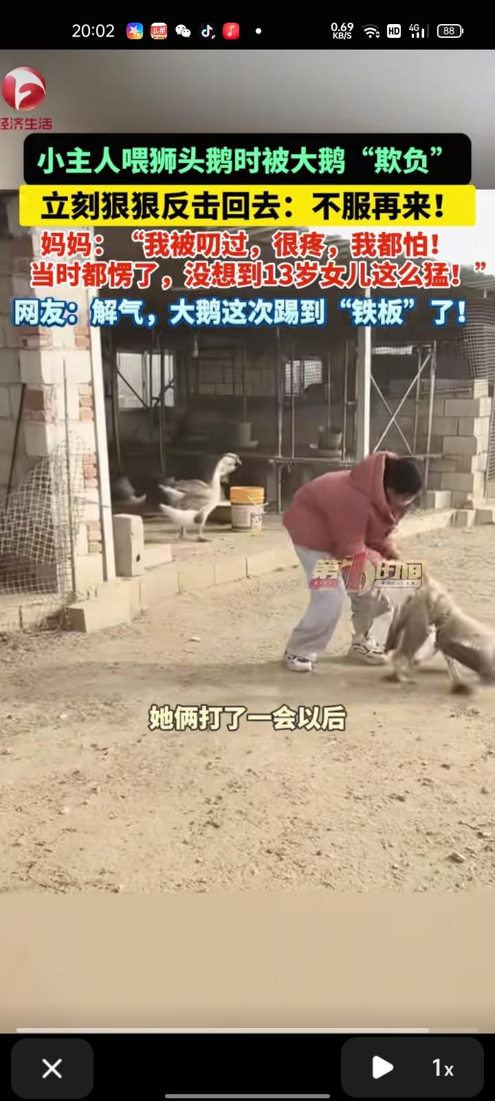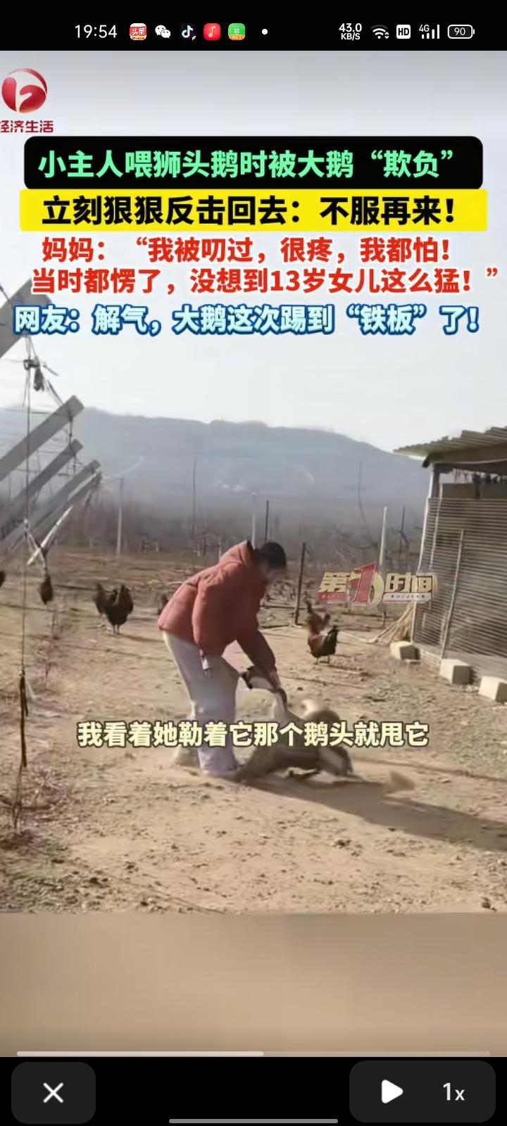 2月3日,烟台栖霞市。叶女士发视频称,女儿喂狮头鹅时被大鹅“欺负”。这只大鹅是前几年她爸爸买来当宠物养的,只要女儿在一般都是她去喂,女儿住校是一般都是自己在喂。有次,大鹅不知道怎么回事被叨了,非常疼。正好女儿放假了,就让她去喂,女儿被叨后一点都不害怕,而是狠狠反击回去,都13岁了还这么猛。她俩打了一会后,最终她获得了胜利,大鹅还是走了