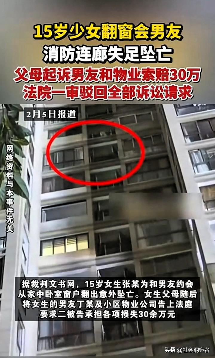 濮阳15岁女孩翻窗赴约坠亡,父母告男友物业索赔30万败诉,法院判决道出核心事实 河南濮阳发生了一件事,一个15岁的女孩张某为了和男朋友约会,从窗外爬出去,结果不小心摔了下来,人没了,她爸妈后来把她的男友丁某和小区物业告上了法庭,要赔三十多万,可法院一审没答应他们的要求,判他们败诉。 法院调查发现,张某和男友丁某通过社交软件认识,案发当晚两人又约了见面,张某在翻自家阳台的消防走廊时不小心摔了下去,父母说物业没装护栏,也没贴提醒,还让丁某进了小区,管得不严,还说丁某一直怂恿女儿翻窗,也得担点责任。 审理中,法院说案涉房屋和消防设施都通过了验收,符合安全要求,物业合同里也没规定得加防护或警示标志,也没私自改过建筑结构,算尽到了基本责任,张某十五岁了,能自己判断事情,该为自己的行为负责,至于丁某,现有证据没法证明他教过张某翻窗,或者知道有危险却没管,坠楼是意外,跟他没直接关系。 判决书还说,张某的父母没怎么留意女儿的心理变化,也没管她平时和谁来往,算不上尽到监护责任,法官明白家里人有多难过,但赔不赔、赔多少得看法律怎么说,不能光因为出了大事就怪到谁头上,现在双方要不要上诉,还没个准信儿。 这起案子又让人说起孩子没人管、外面乱糟糟的危险,还有物业到底该管到哪一步,冲动加上没人留意,事情本来能躲开,可法律还得看证据,按事实说话。