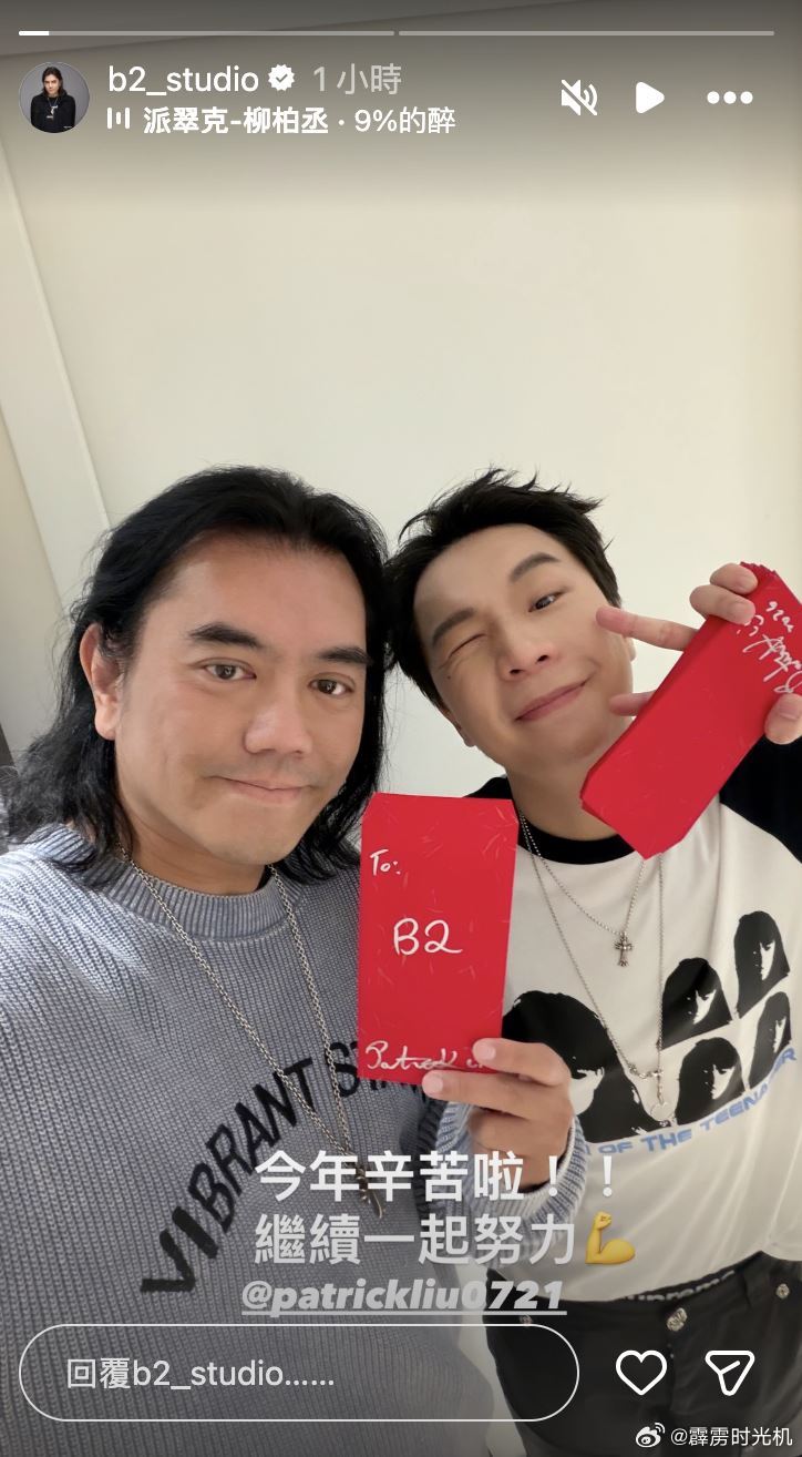 B2近日在IG限時動態分享與Sandy的合照,紀念品上寫著「後會有期」,他也寫下「謝謝珊迪,合作愉快喔~」而派翠克則是「今年辛苦啦,繼續一起