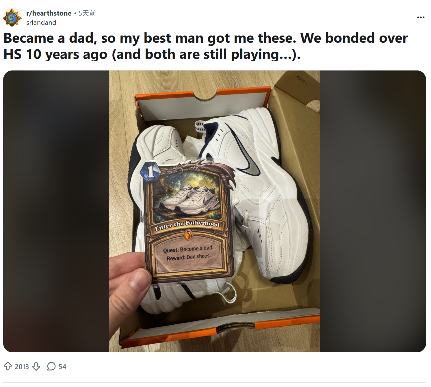 炉石传说 国外一玩家晋级奶爸,好兄弟送的礼物太顶了!1费任务:《晋升奶爸》任务:成为一名奶爸。奖励:老爹鞋。