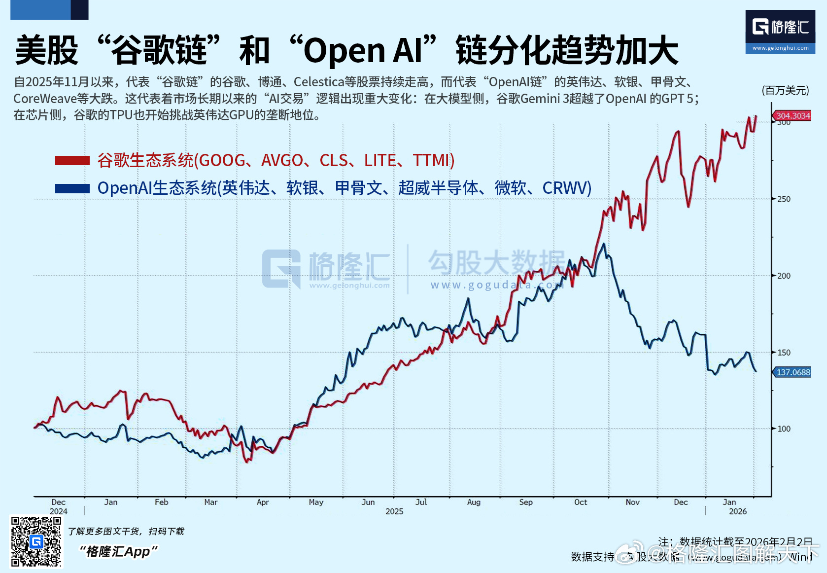 自2025年11月以来,代表“谷歌链”的谷歌、博通、Celestica等股票持续走高,而代表“OpenAl链”的英伟达、软银、甲骨文、CoreWeave等大跌。