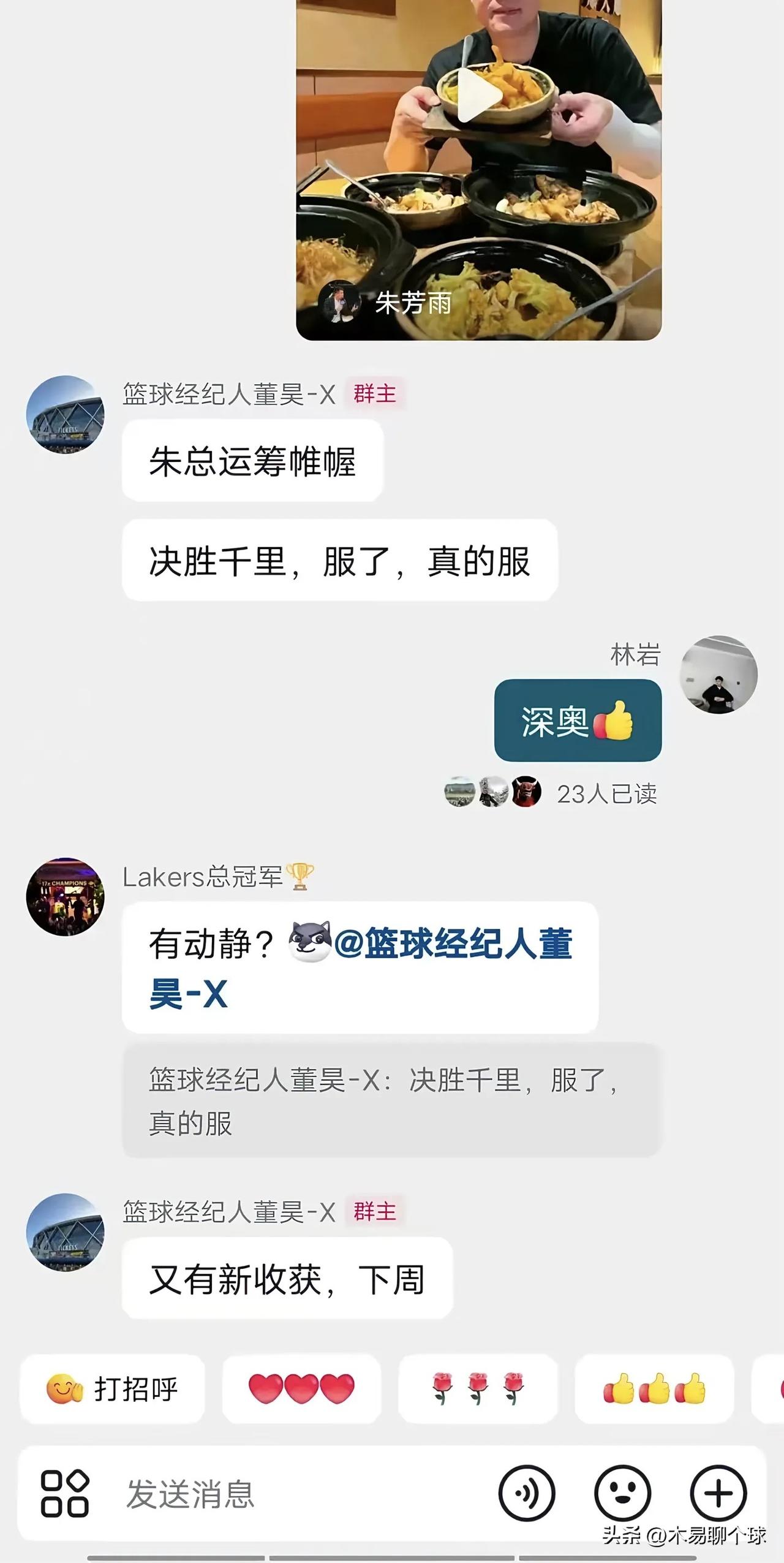 广东男篮重磅引援:下周揭秘! 据篮球经纪人董昊聊天截图透露,广东宏远男篮俱乐部总经理朱芳雨近期有大动作,并且已经有了收获。本赛季,广东男篮虽然阵容豪华,但是队内崔永熙麦考尔两大主力第一阶段处于康复期,而主力徐杰、萨林杰和焦泊乔也是因为伤病偶有伤缺!球队阵容实力无法真正发挥出来,而且,由萨林杰、焦泊乔和王少杰组成的内线组合远没有达到球队需要!因此,引进一名大外援势在必行,董昊这一爆料说明广东男篮的目标锁定夺冠,让我们共同等待吧!广东男篮