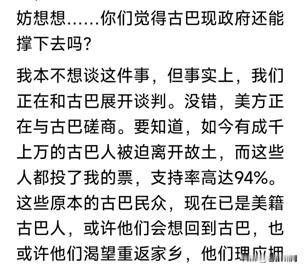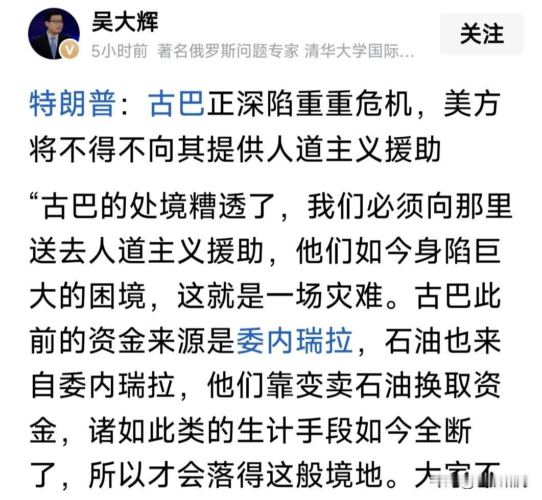古巴举行大规模游行示威,抗议美帝封锁制裁,誓死捍卫主权,反对霸权! 特朗普却说:古巴正深陷严重危机,我们将不得不对其提供人道主义援助! 老特承认:古巴现在面临的危机,是因美国切断委内瑞拉石油供应,不能用石油换取资金了,才造成这样的困难。 但他又说:我们正在与古巴磋商,缓解紧张关系的条件!已经有成千上万的古巴人逃往美国,成为了美国的公民。 他们在美国总统选举中,大多数都支持我。如果美古关系缓和,这些美籍古巴人,也可以回家看看,希望会这样! 以上川普所谈,有三个问题很重要: 1.面对古巴困境,美国也要出手援助? 2.古巴很多人逃到美国,成为美国人。 3.美古正在谈判,缓和两国关系! 苍狼关心的是:缓和关系条件是什么?像委内瑞拉哥伦比亚那样,向老美靠拢吗?但古巴背后的大鹅会同意吗? 古巴举行大规模“反美游行示威”,是给谁看的?老美还是大鹅?川普说的“双方正在磋商”,应该不是瞎话吧? 美古能否达成共识?像委哥那样“对美妥协”?一步走错会导致相反结果。古巴何去何从?真的令人揪心呐! …………