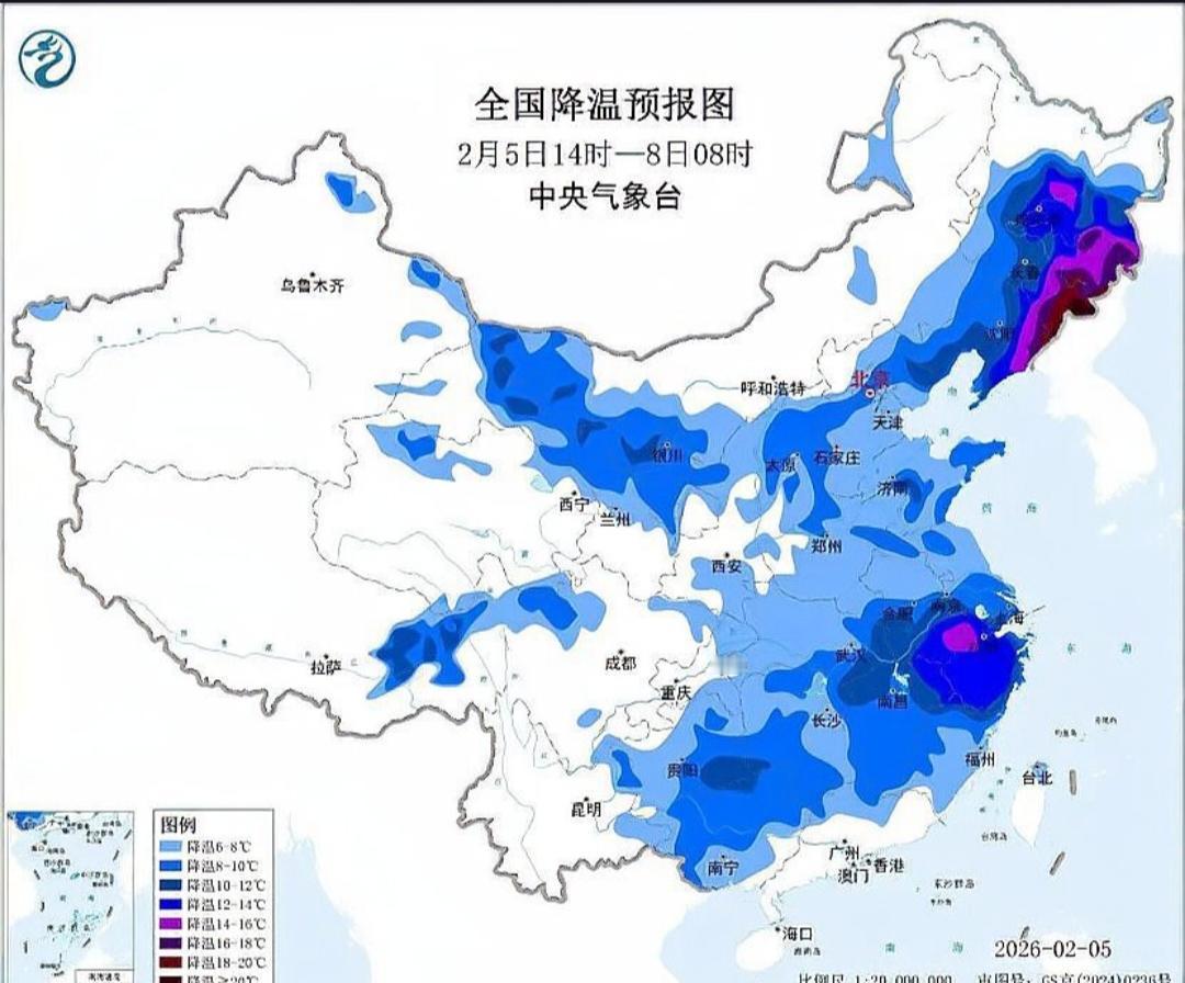 新一轮寒潮来袭,我国中东部地区将迎来剧烈降温,多地将现大到暴雪,局地降温超20℃,民众出行需加强保暖措施。 随着新一轮寒潮的到来,我国中东部地区将经历显著的气温波动,预计自2月5日起,气温将大幅下降,多地降温幅度将达到6℃至10℃,东北地区东部、江南中东部、江淮南部的部分地区降温可达12℃至16℃,甚至局地降温超过20℃。中央气象台已发布寒潮蓝色预警和大风蓝色预警,提醒公众做好防寒准备。此次寒潮还将带来广泛的雨雪天气,特别是江苏、安徽、上海、浙江中北部等地可能出现大到暴雪,对交通出行造成一定影响。气象部门建议,公众应密切关注天气变化,适时增添衣物,确保身体健康。