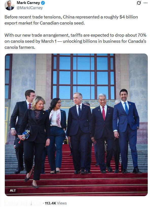 加拿大总理卡尼最近又提起了他访华的成果。他在社交媒体上说,这次访问为加拿大的油菜籽农户找到了价值数十亿美元的商机。 事情是这样的。在这次访问中,中加双方达成了一个互惠协议。简单说,加拿大同意大幅降低对中国电动汽车的惩罚性关税,作为交换,中国也将加拿大油菜籽的综合关税从很高的水平,削减了大约七成。 这对于加拿大农民来说,是个实实在在的好消息。中国曾经是加拿大油菜籽每年约40亿美元的大市场,但在之前贸易紧张时期严重萎缩。新协议一签,中国的进口商很快行动,一口气订购了数十万吨的油菜籽。有分析预计,这将为加拿大农业带来全年约30亿美元的出口收益,并能缓解他们仓库里堆积如山的库存压力。 加拿大这么积极,背后有它的苦衷。过去几年,它紧跟美国对华政策,结果招来了中方对油菜籽等产品的反制措施,导致对华出口暴跌,不少加工企业倒闭。另一边,虽然经济上极度依赖美国,但美方的一些强硬言论和不确定性,也让加拿大感到焦虑,迫切想为自己的产品寻找更稳定、多元的市场。 所以,这次协议被很多部分析人士看作加拿大的一次“务实转身”。它用本国市场其实并不大的电动汽车作为筹码,换回了关乎农业命脉的油菜籽市场的重启。这笔账,算盘打得挺响。 这个动向也引起了连锁反应。加拿大作为西方阵营的一员率先与中国“破冰”,紧接着德国、英国也在电动汽车准入上有所放宽。这暴露了西方在对华贸易政策上并非铁板一块。 当然,协议能否完全落实,还存在一些疑问。比如最终的贸易额能否达到预期,以及会不会受到来自其他方面的政治压力。但无论如何,对加拿大许多面临困境的农户来说,东方市场重新打开大门,无疑是一个值得期待的转机。这也清楚地表明,在复杂的全球贸易中,利益和生存的现实,往往是最直接的推动力。