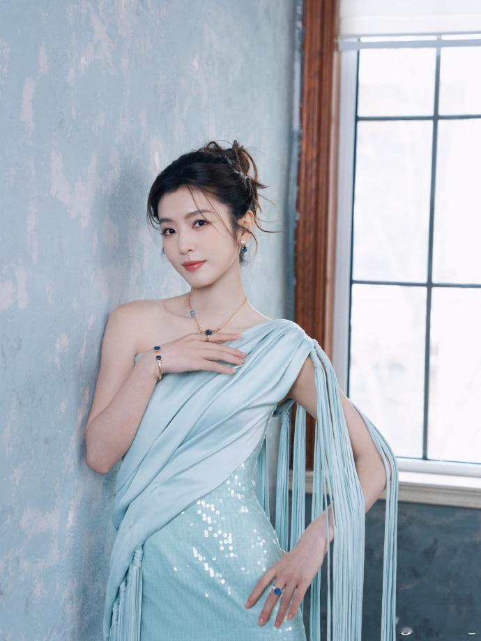 李云霄薄荷绿单肩流苏裙李云霄利落盘发衬得气质出众,薄荷绿裙装清新雅致,一颦一笑尽
