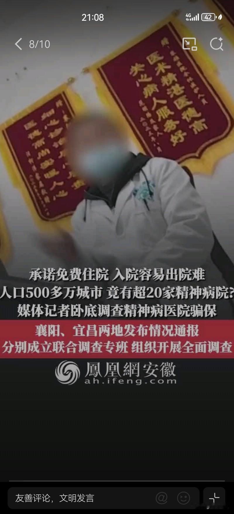 最权威的官方通报来了, 查!一查到底!据国家卫生健康委相关负责人2月5日介绍,针对湖北襄阳、宜昌部分医院违规收治、套取医保、侵害患者权益问题,将派工作组赴鄂督导彻查! 医保基金是百姓救命钱,容不得被无良机构肆意侵占;精神疾病患者更是弱势群体,不该沦为牟利工具。 500多万的人口,20多家精神病医院,把正常人变成神经病,把医保当成提款机,拉一个进去1000人头费,每名病人每月套利五千,一家医院年获利几百万,进去了别想出来,管你是不是精神失常。 虚构诊疗、强制收治、虐待患者,这些行为突破医疗底线、触碰法律红线,必须零容忍! 期待工作组可以从严追责、堵住漏洞,护好百姓救命钱,守住弱势群体的基本权益!