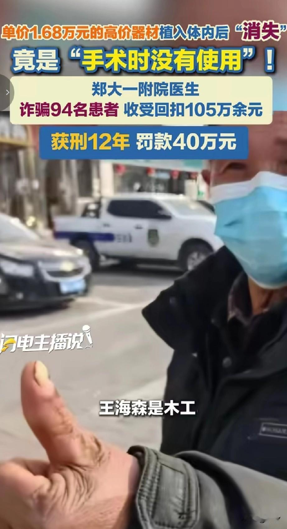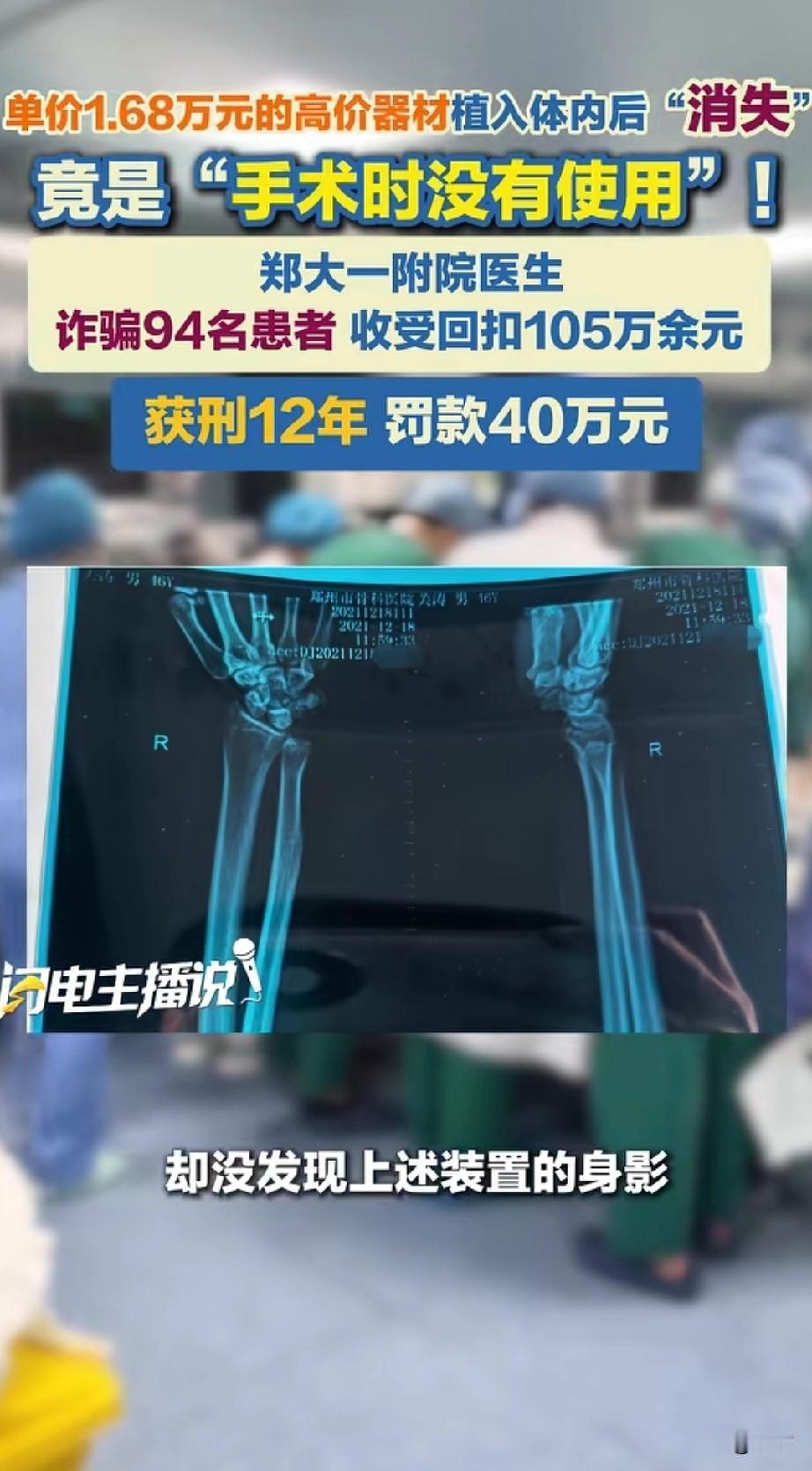 单价1.68万元的医疗器材植入体内居然消失,细查之后发现根本就没有使用, 郑大一附院这下真火了! 作为亚洲最大的医院,他的副主治医生王福建四年手术中使用了343个微血管吻合装置,收受回扣105余万, 其中94名患者中使用了128个稳合装置,明知不适用而计费,共计收取的205 余万后被认定为诈骗资金, 去年王福建获刑12年,罚款40余万元,他的落网还是因为他的一名患者王海森, 2018年他的左拇指被电锯切断,工友把他送进了郑大一附院,两个声称植入体内的稳合装置花了他3万多元, 三年后他在拍X光片的时候,居然没发现这个装,由于这个装置上面带有不锈钢钉,所以说不可能被身体吸收,除非当时就没有装! 这让意识到受骗的他立刻报了警,叔叔调查才发现了这起惊天大案!调查后才发现这位郑大一附院的副主任医师王福建诈骗了94名患者, 谁也想不到亚洲第一大医院医生居然干这种事,这样的医生简直是医学界的耻辱,为了收受回扣,居然这么操作, 这样的人获刑12年,一点都不冤,不过为啥罚40余万元?不应该将他收受贿赂的105余万全部没收之后再罚款吗? 大家觉得这样对吗? 河南 郑大一附院 郑州医疗 郑州医院事件 医疗器械陷阱 植入医疗器械