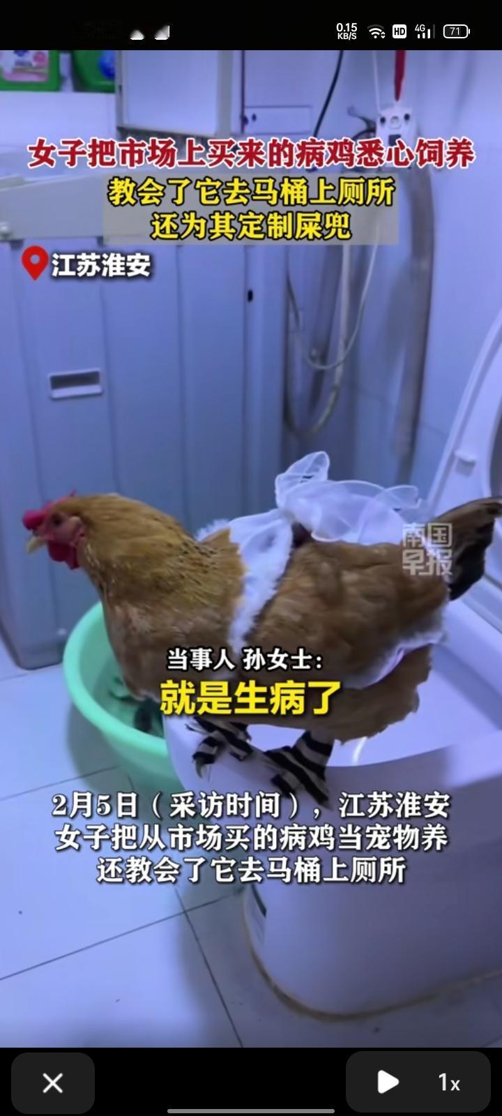 2月5日,江苏淮安。女子把从市场买的病鸡当宠物养,还教会它去马桶上厕所,还为它定制屎兜。 当事人孙女士表示,已经给鸡买了点药回来,能治好的以后再吃,一个星期后就好了,结果它下蛋了,拉屎也拉了很多,就想把它抱到厕所里上,它立马就拉了。