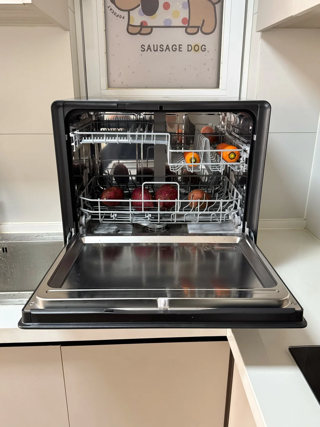 我一般会在做饭前先把水果蔬菜扔进去洗。正好吃饭的时候可以再吃点水果,吃完饭就把碗筷全扔进去,然后我就去打游戏了。等到下次用的时候再去拿出来,直接被我当碗柜使了,还挺方便的哈哈。我用下来就是说!这1500花的真值!用起来真香!
