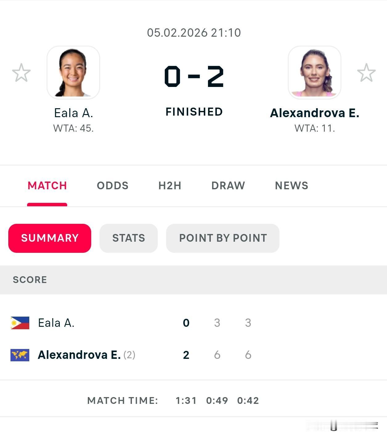 阿布扎比500赛 亚利山德洛娃6-3/6-3菲律宾一姐 整个赛场明天起就清静了。 祝贺🎉🎉🎉🎉🎉🎉