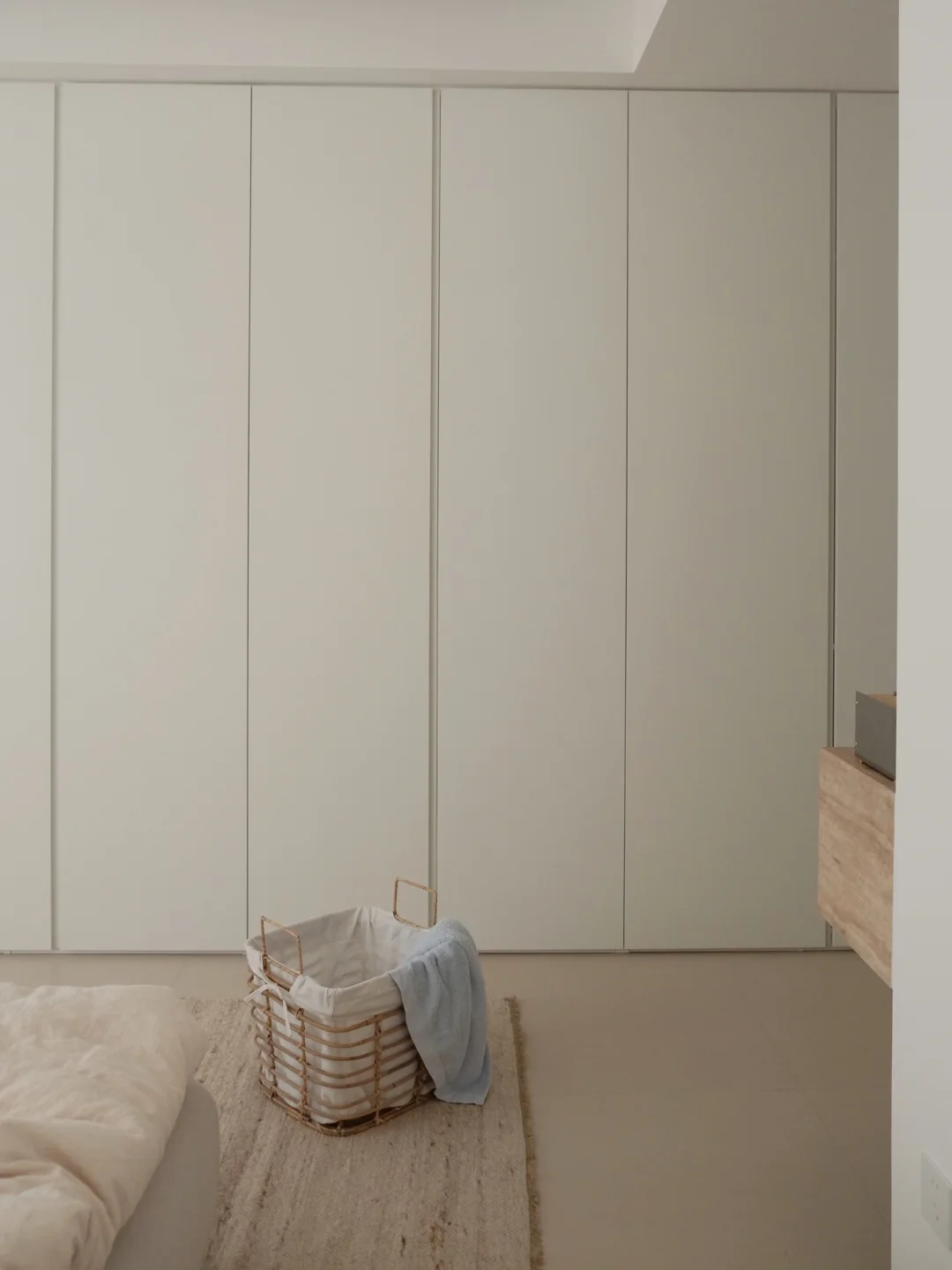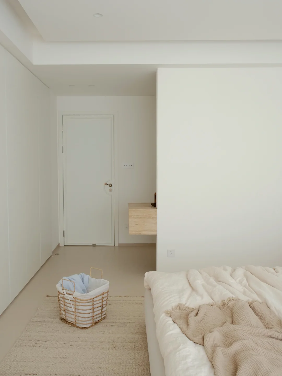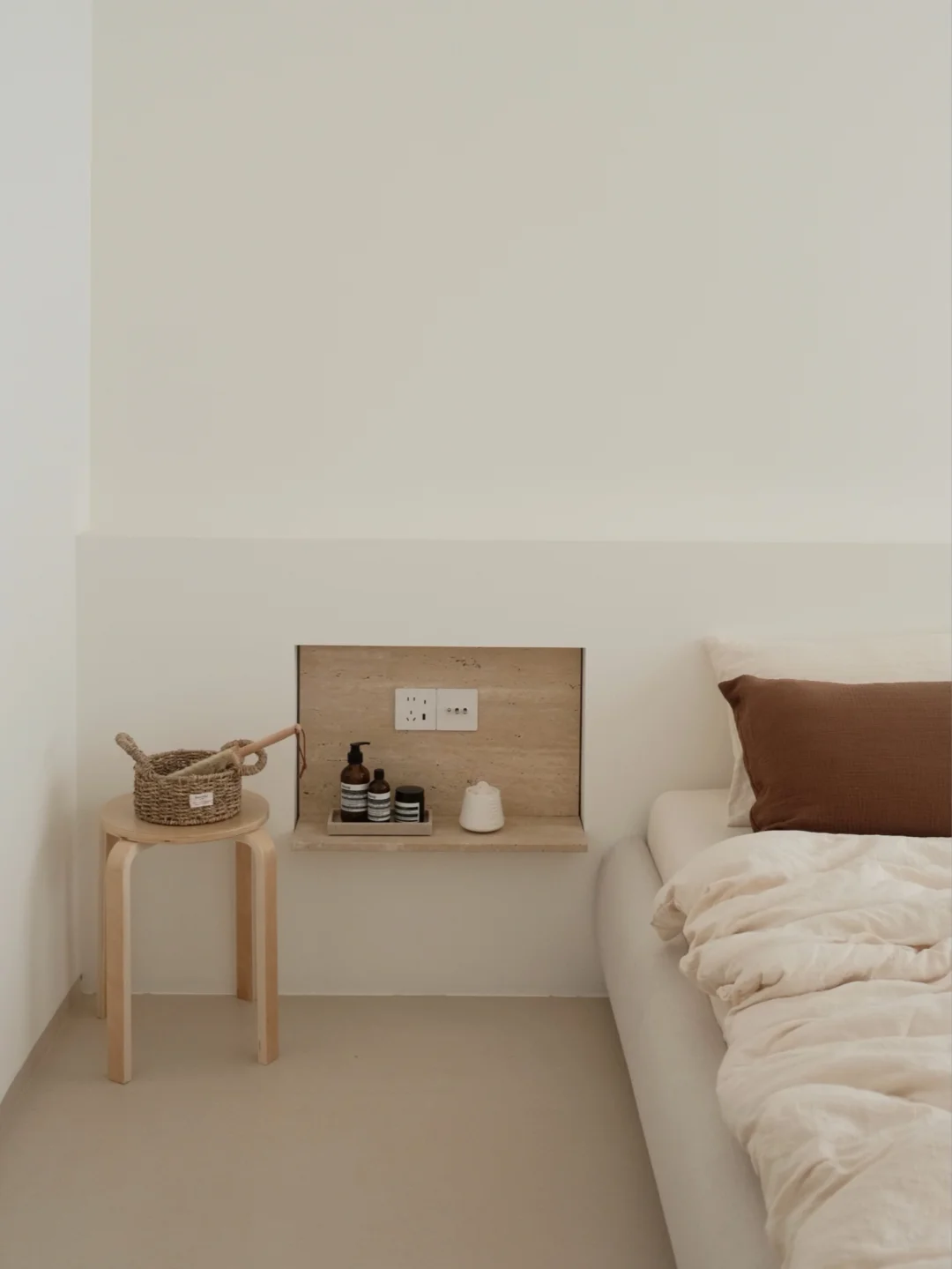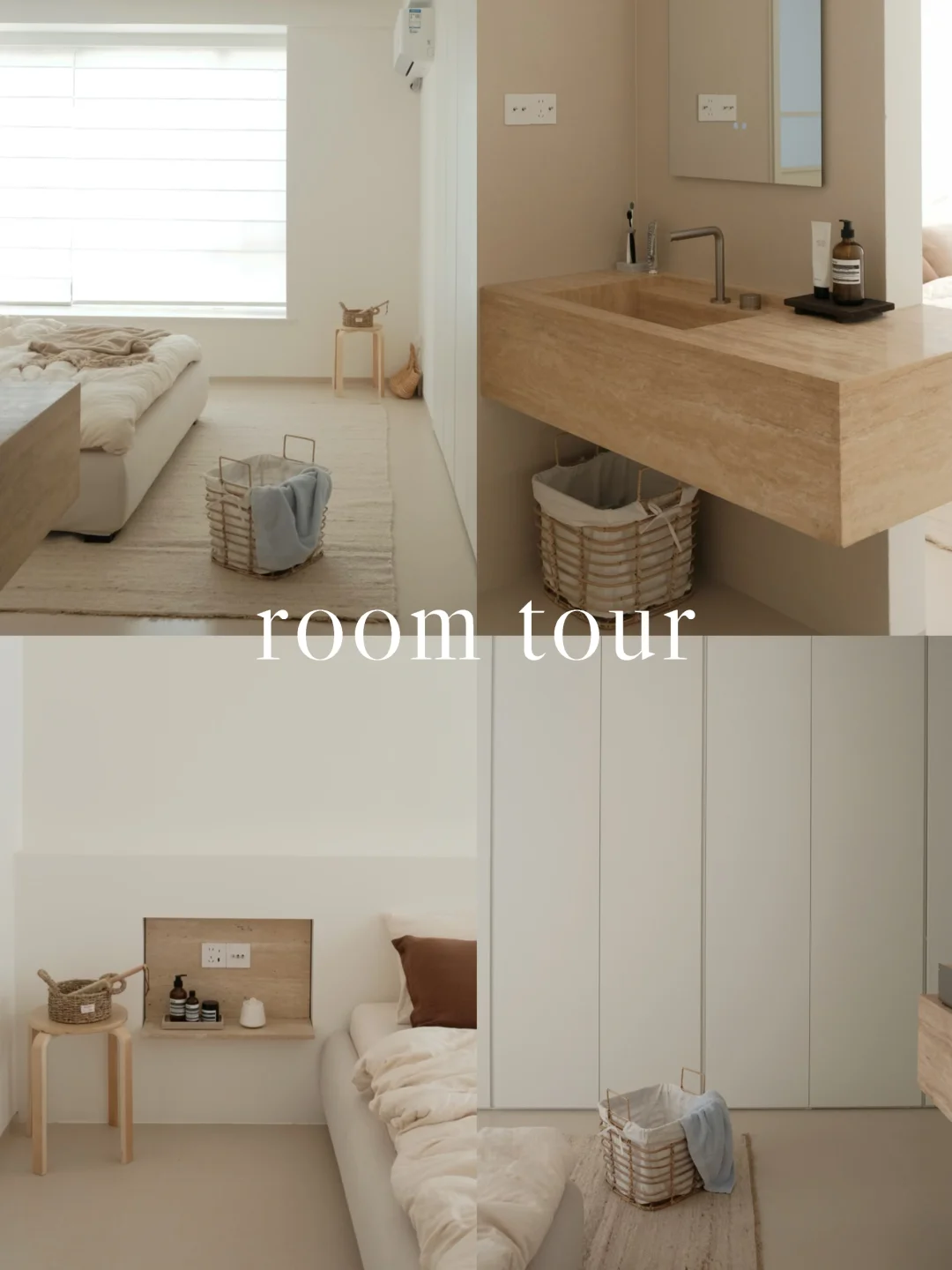 是整体以低饱和度的米白 浅木色为主色调 营造出宁静 松弛的居住氛围 做了干湿分离 一进门就是洗手台 用了洞石做悬浮洗手台 弱化空间边界感,让卧室与卫浴等功能区自然衔接 选择了无床头的床 更加轻盈不厚重 床头柜也是嵌入了洞石悬浮出来 床尾搭配了一张地毯 整体更有氛围感 一整面墙的一门到顶衣柜 做了铣槽拉手 让衣柜没有那么单调 - 已经幻想每天回到家就像躲进了一个温柔的结界 这种松弛感,才是家该有的样子啊~