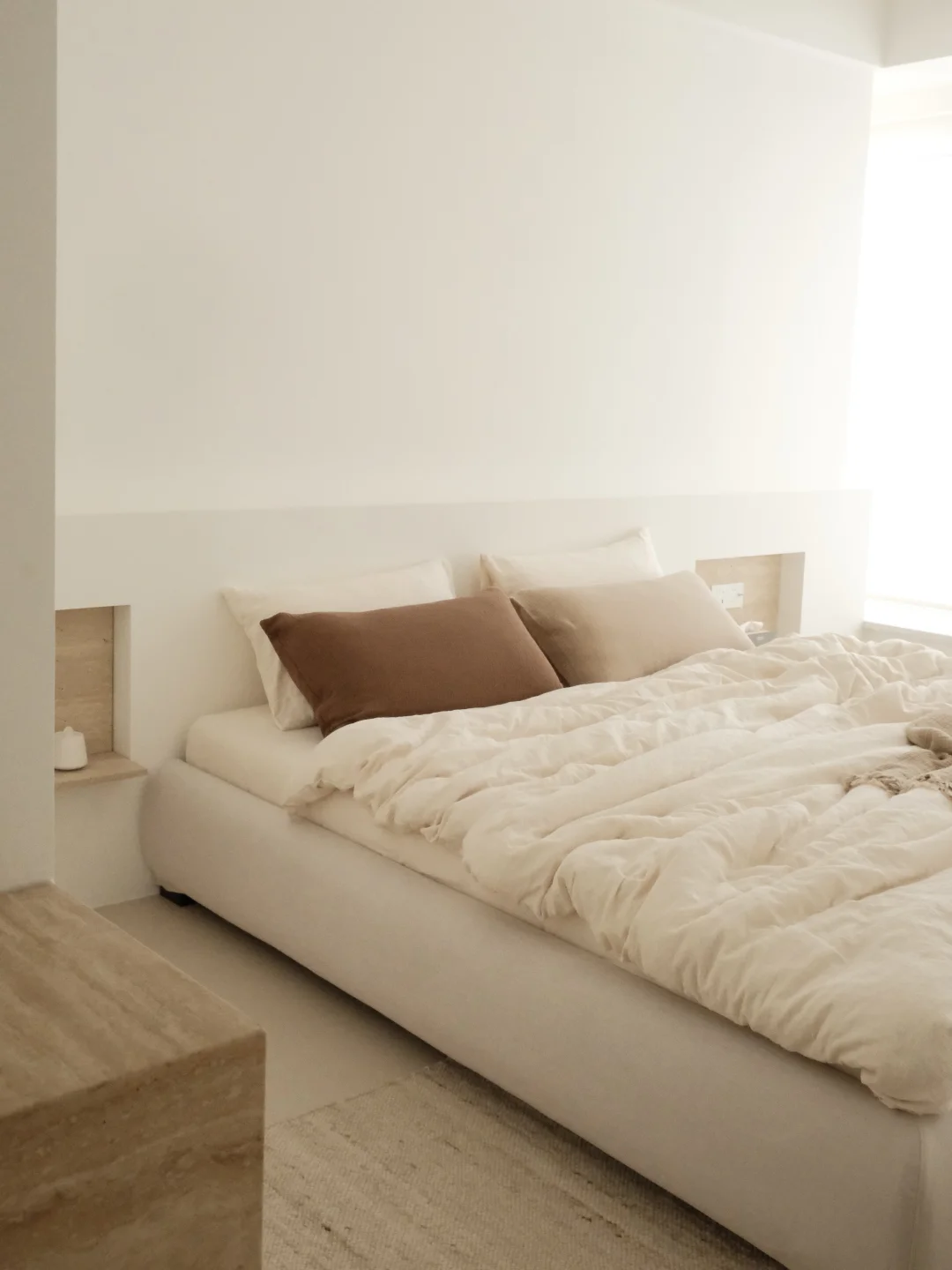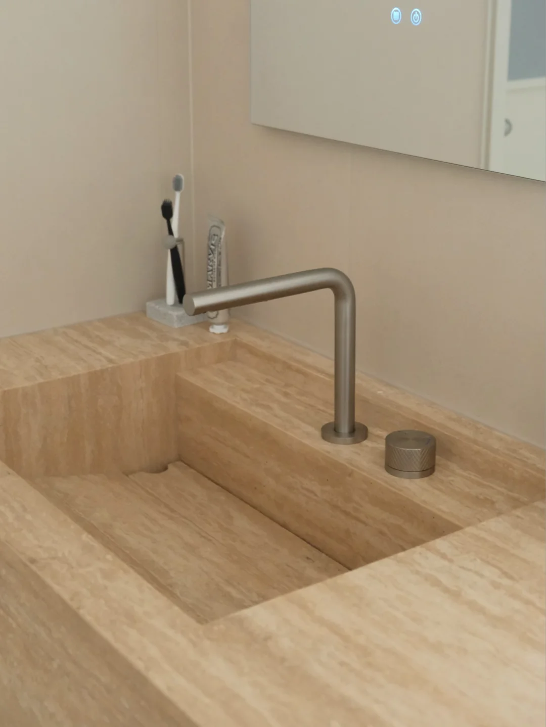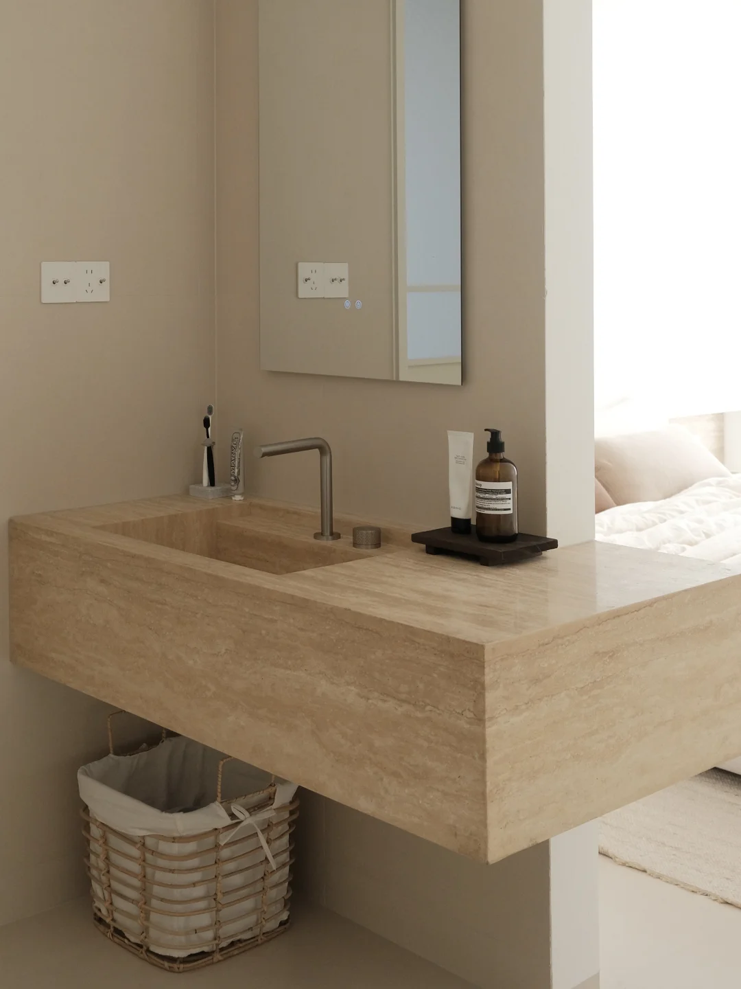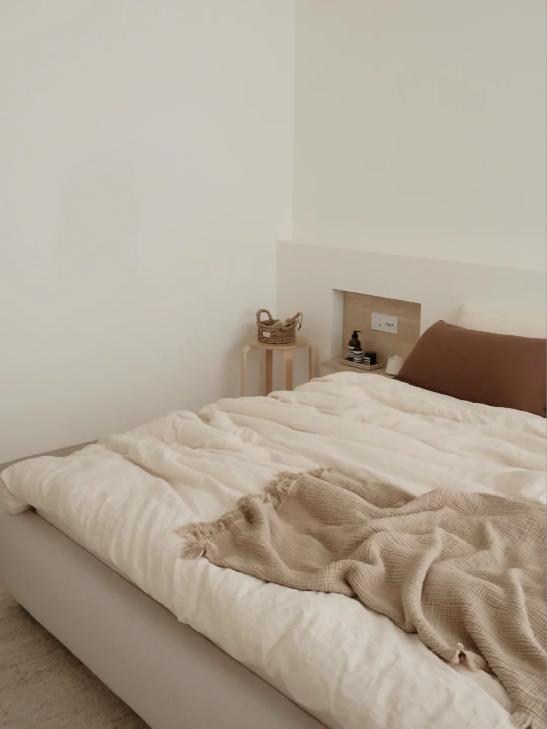 是整体以低饱和度的米白 浅木色为主色调 营造出宁静 松弛的居住氛围 做了干湿分离 一进门就是洗手台 用了洞石做悬浮洗手台 弱化空间边界感,让卧室与卫浴等功能区自然衔接 选择了无床头的床 更加轻盈不厚重 床头柜也是嵌入了洞石悬浮出来 床尾搭配了一张地毯 整体更有氛围感 一整面墙的一门到顶衣柜 做了铣槽拉手 让衣柜没有那么单调 - 已经幻想每天回到家就像躲进了一个温柔的结界 这种松弛感,才是家该有的样子啊~