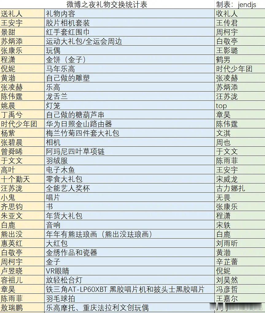 找到一个微博之夜交换礼物表(过年想送年轻朋友啥的可以参考微博之夜