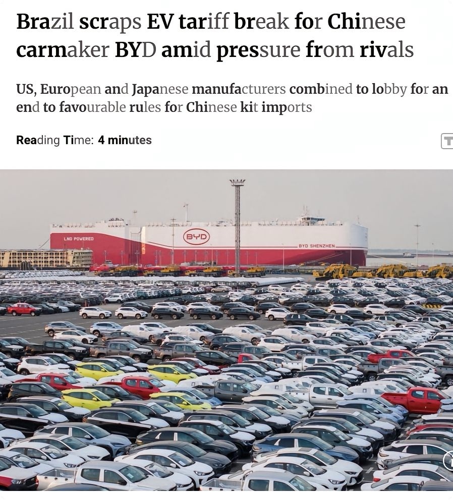 外媒:巴西取消了给予中国车企比亚迪的电动汽车关税豁免政策,该政策曾允许使用中国进口零部件组装的电动车以较低成本进入巴西市场。豁免于1月31日到期且未被续期。此前,美国、欧洲和日本车企联合游说要求结束对中国零部件进口的优惠规则。未来,比亚迪和长城汽车等企业需按新规定支付更高的进口税,SKD(半散装件)和CKD(全散装件)的进口税率分别从18%和16%上升至35%,这将显著增加依赖进口零部件的车企成本。