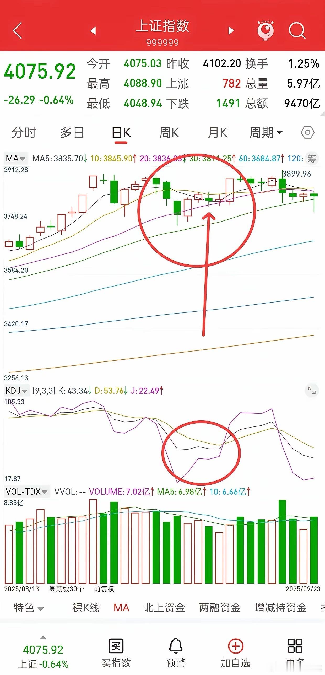 A股,今天暴力洗盘,接下来历史或许总是惊人的相似!截止目前,大盘收盘正好收在五日线上,和9.9号当天一样,收盘也是收在五日线之上。今天早上盘前就说,这里观察洗盘力度,主要对比去年9.8号和11.25号后面的走势。现在看来,更像9.9号的走势。无论从K线还是技术指标,以及洗盘角度,全部一样,左底打到前顶4025-3985区间,反弹两天站上五日线,开启洗盘,力度也一样!因此,我认为,明天如果还是震荡,那下周一直接拉中阳,再或者明天直接拉中阳。而且,一旦拉中阳,行情短期直接结束,看看9.11号后面走势。所以,接下来这波机会,逮到就逮到了,逮不到,就逮不到了!