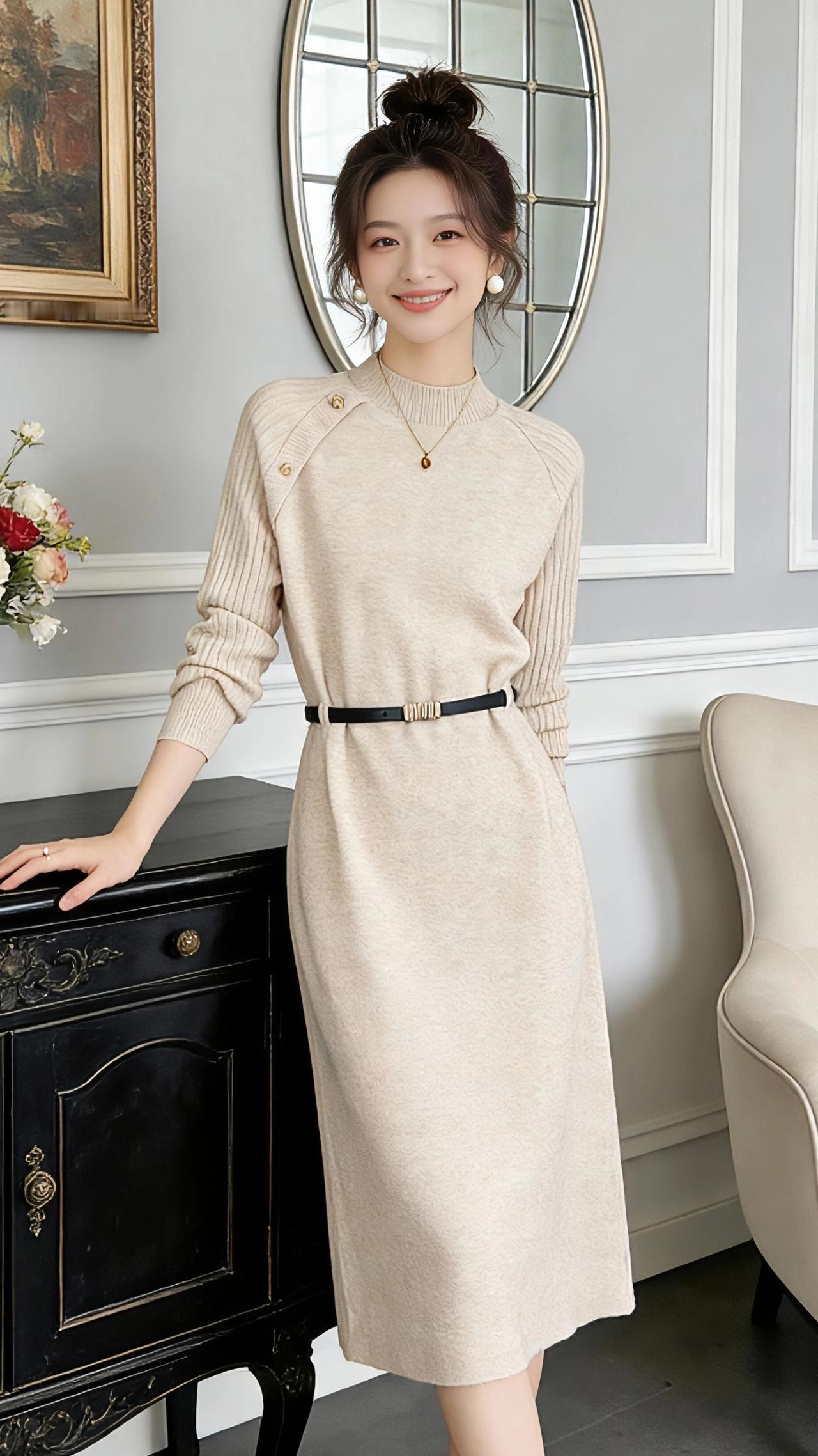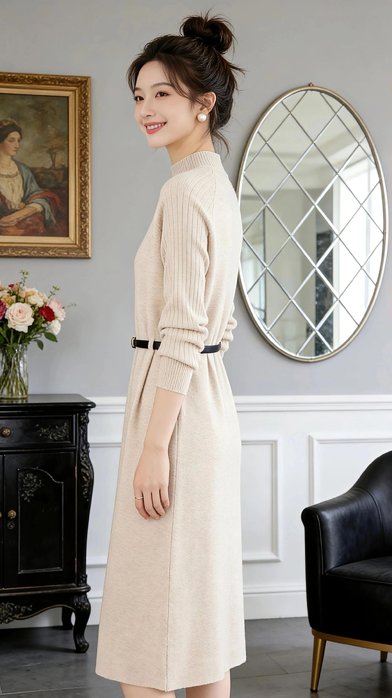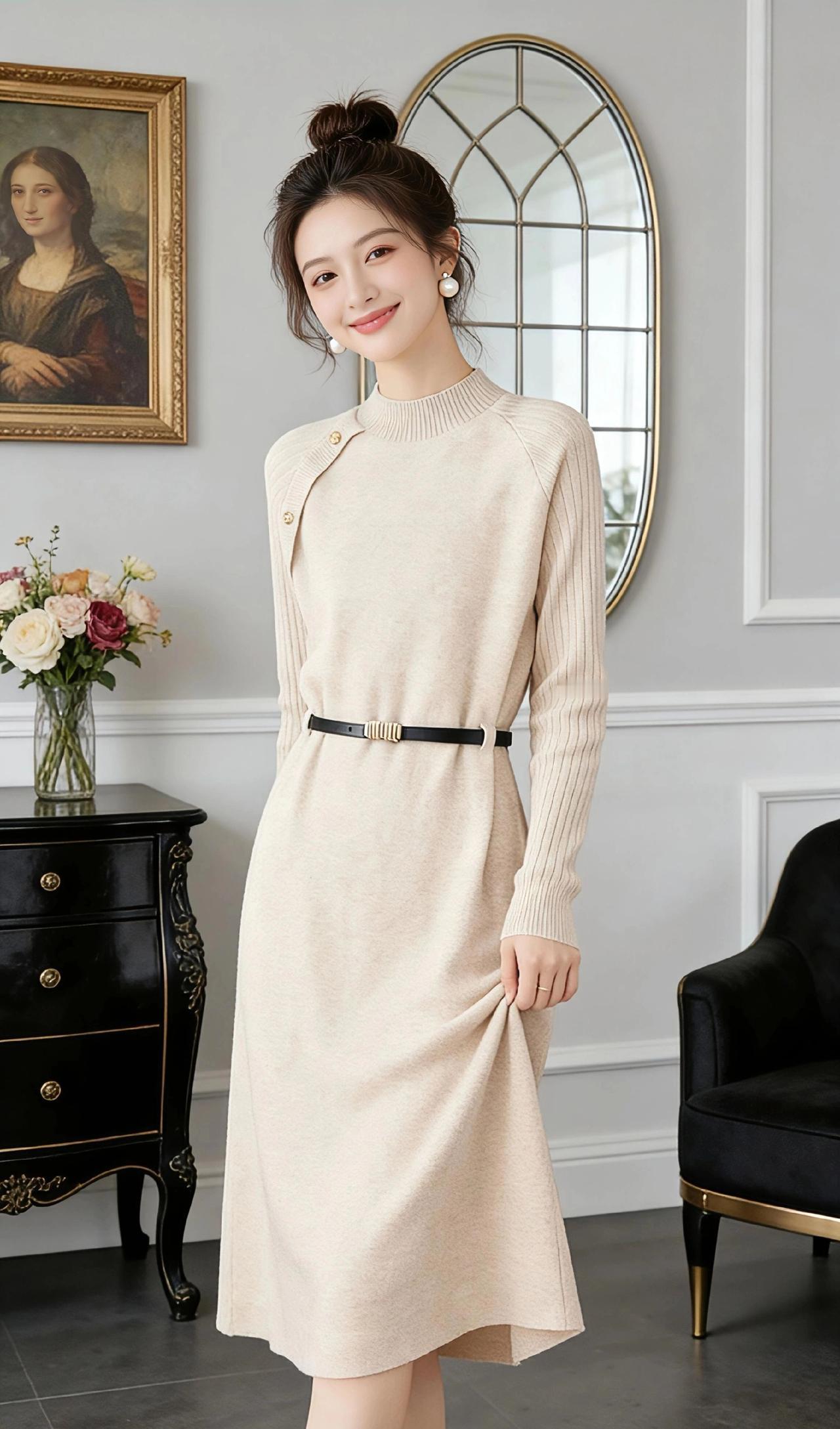 米杏色的温柔序章 浅米色的针织裙裹着初冬的软意,在灰调的欧式房间里,漾开一圈圈温柔的涟漪。 半高领贴着颈窝,像一杯温好的燕麦拿铁,妥帖又暖。肩头的两颗金扣是藏在细节里的小心思,像午后阳光穿过雕花窗棂落在织物上的光斑,不张扬,却足够点亮整个画面。黑色腰带轻轻一收,便把松弛的针织感束出恰到好处的腰线,如同风掠过湖面时,被拢出的那道柔软弧线。 她赤脚站在深灰地砖上,裙摆垂到脚踝,走动时带着羊绒特有的糯感。有时斜倚在雕花柜边,指尖掠过描金的木纹;有时侧身轻提裙摆,露出一截纤细的脚踝;有时只是静静站着,丸子头蓬松得像一团云,耳上的珍珠耳坠随着笑意轻轻摇晃。 墙上的椭圆镜映着她的身影,镜格把光线切得细碎,和针织裙上的竖纹肌理相映成趣。柜上瓶花正盛,玫瑰粉与奶油白的花瓣,和裙身的米杏色融在一起,让整个房间都浸在一种不疾不徐的温柔里。 这裙装没有夺目的色彩,却胜在与时光的默契。它像一封写在针织上的信,用软糯的触感、克制的线条,诉说着属于秋冬的松弛与优雅——不必追赶潮流,不必刻意讨好,只是安安静静地做自己,就已是最美的风景。 高级感穿搭 新年穿搭羊毛裙 连衣裙