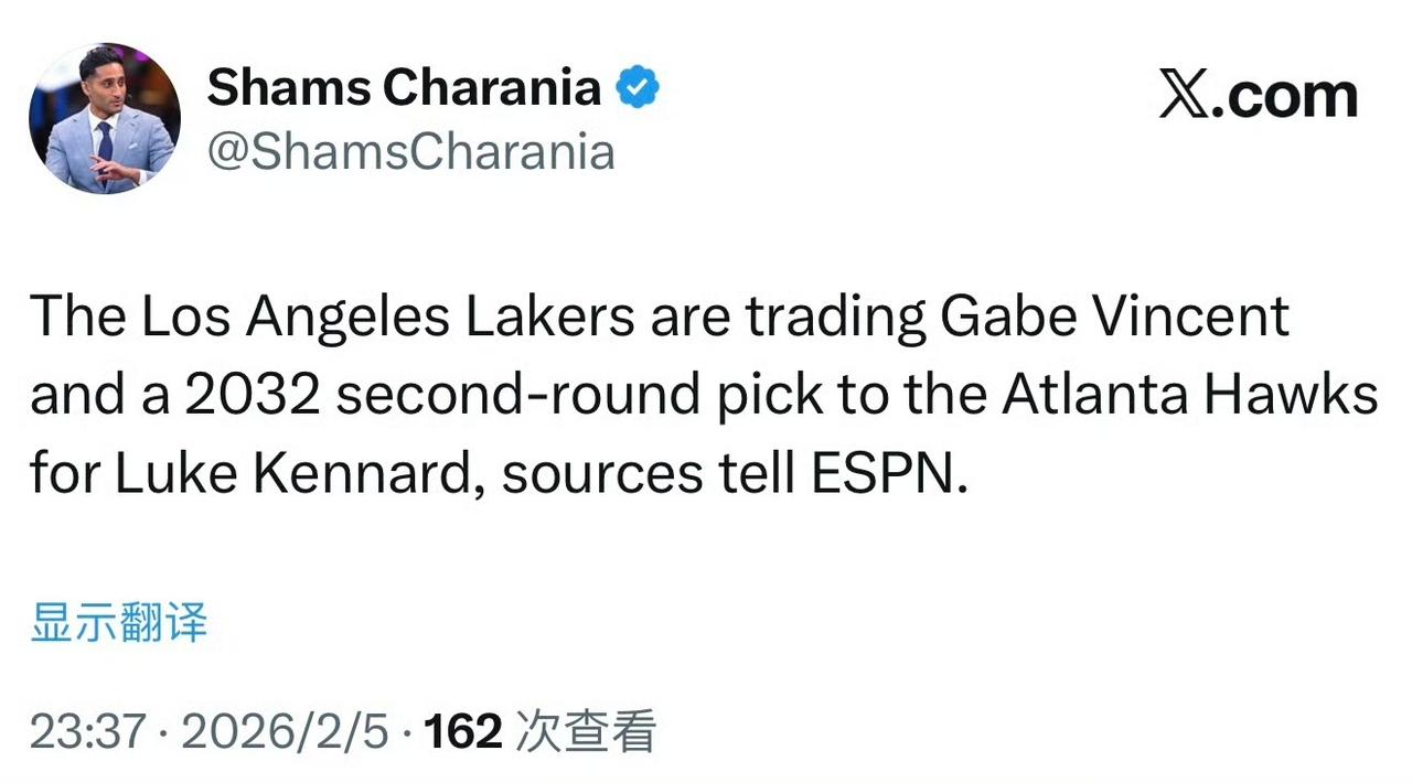 Shams:文森特去老鹰!湖人将文森特和一个2032年的次轮选秀权交易至亚特兰大老鹰队,换来卢克·肯纳德。 湖人 洛杉矶湖人 篮球 NBA
